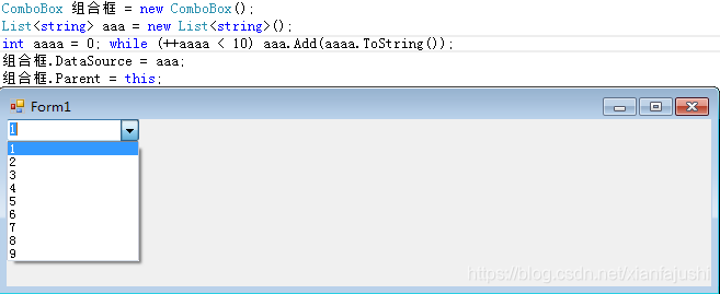 ComboBox 组合框 = new ComboBox();List<string> aaa = new List<string>();int aaaa = 0; while (++aaaa < 10) aaa.Add(aaaa.ToString());组合框.DataSource = aaa;组合框.Parent = this;//组合框.Items.AddRange(new object[] { "111", "222", "333", "444" });//组合框.DropDownHeight = 1;组合框.SelectedIndex = 0;//组合框.DropDownStyle = ComboBoxStyle.Simple;