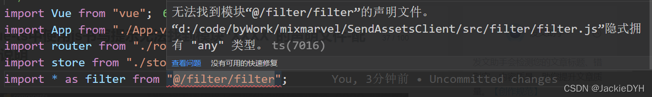 无法找到模块“@/filter/filter”的声明文件。“d:/code/byWork/mixmarvel/SendAssetsClient/src/filter/filter.js”隐式拥有 "any" 类型。