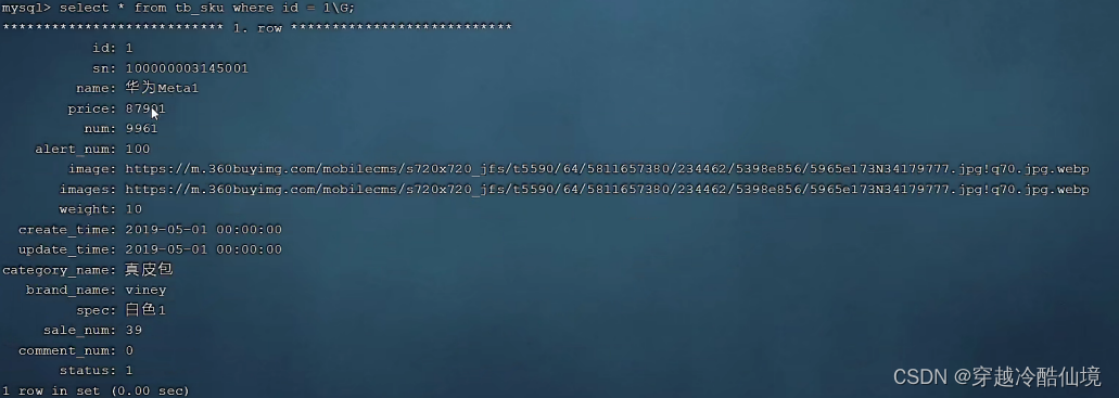 这张表中id为主键,有主键索引,而其他字段是没有建立索引的。 我们先来查询其中的一条记录,看 看里面的字段情况,执行如下SQL: