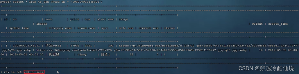 我们可以看到根据sn字段进行查询,查询返回了一条数据,结果耗时 20.78sec,就是因为sn没有索 引,而造成查询效率很低。