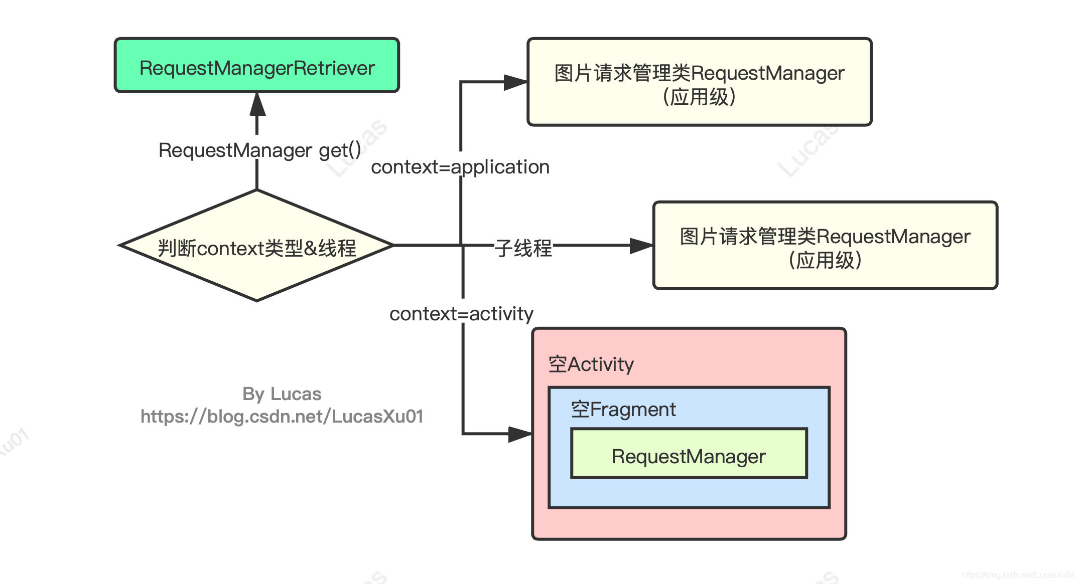 看到这一行:if (Util.isOnMainThread() && !(context instanceof Application)),这行判断不仅决定了子线程中直接返回getApplicationManager(context)方法,而且当这个传入的context是Application时,也返回全局的getApplicationManager(context)方法获得的应用级别RequestManager。