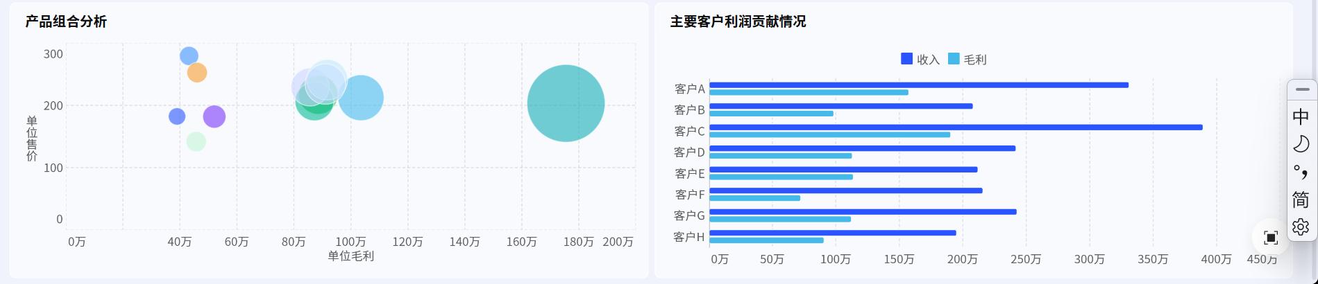 - 客户维度: 客户A和客户B是优质客户,因为他们收入和高都处于最高水平,要重点维护并且优先保障资源;而客户H 是高维护成本客户,他的收入柱很长,但毛利柱极短,说明占用大量公司资源却贡献微薄利润,需要重点审查并优化合作策略;此外还可以挖掘潜力客户D和E,收入和毛利处于中等水平,有一定价值且提升空间巨大。