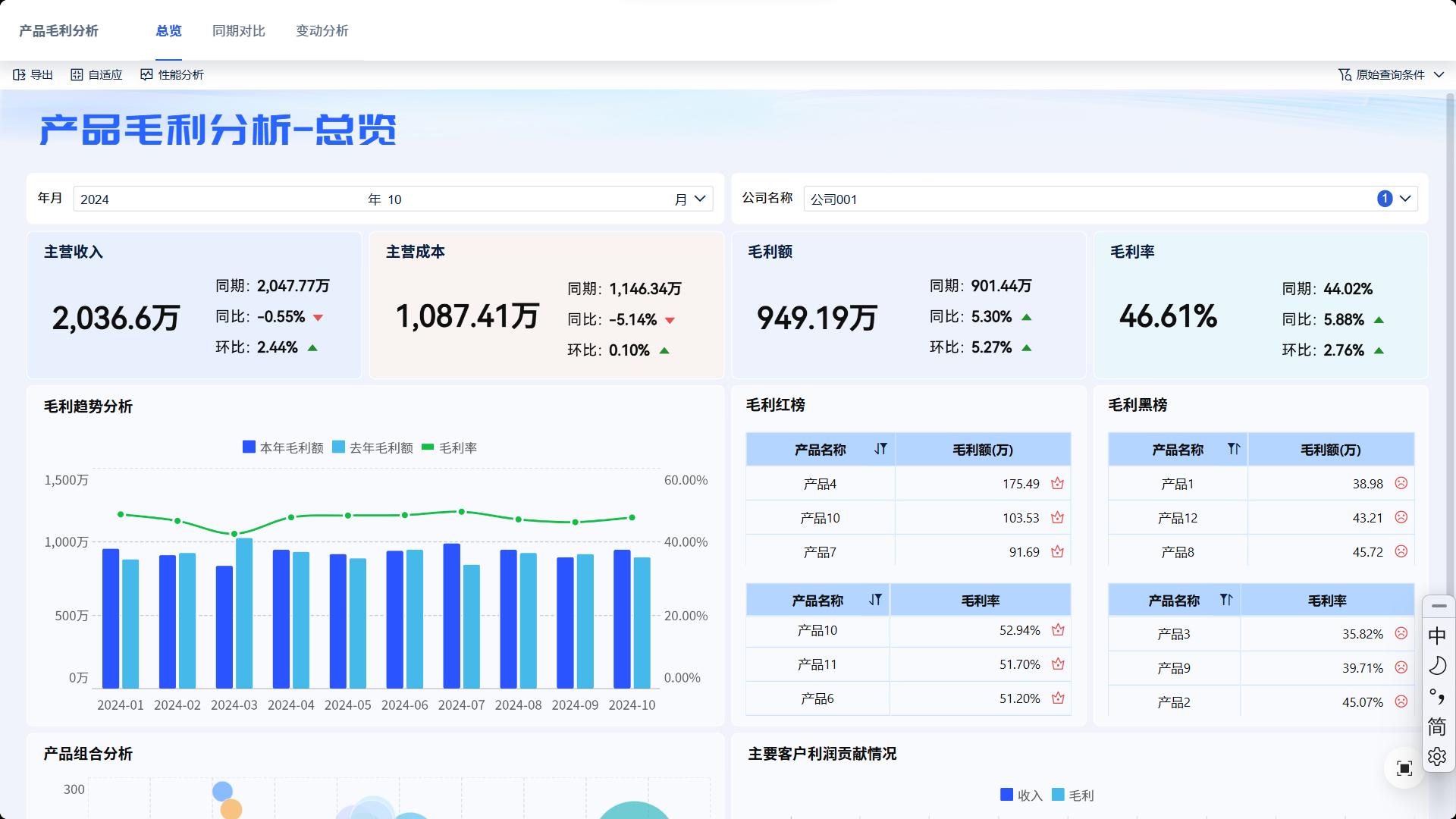 - 产品维度:产品10的毛利额和毛利率都位于前3,是真正的“利润牛”,而产品1的毛利额最低,说明它给公司带来的利润最低。