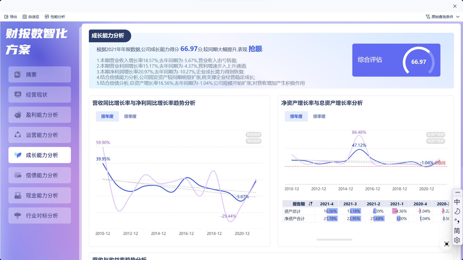 公司成长能力综合评分为66.97,表现强劲。可以看到营收、营业利润和净利润三大增长率均由去年同期的负值强势转正,同时,总资产扩张明显,并且净利润增速高于营收。