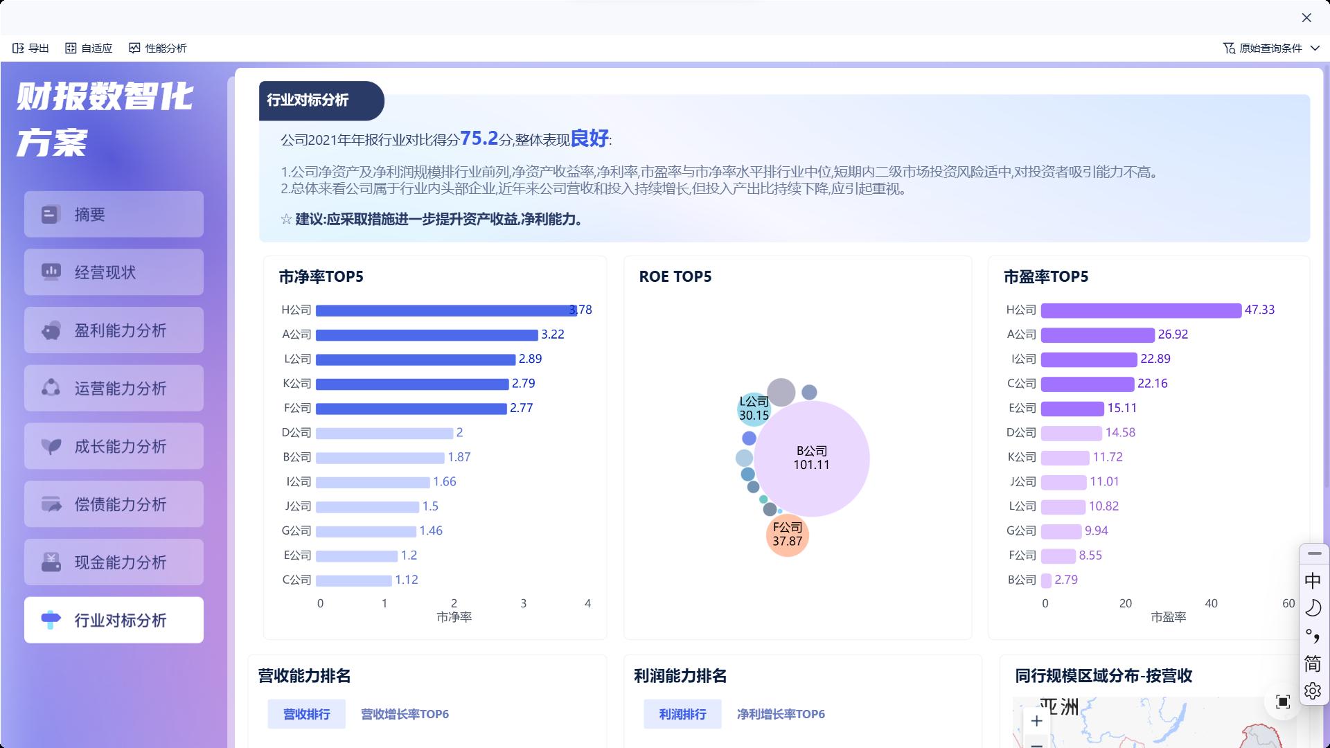 结合图片我们可以得知,公司在行业内的净资产和净利润规模位居前列,行业对比得分为75.2分,整体表现良好。不过需要注意效率问题:净资产收益率(ROE)仅处于行业中游水平,且投入产出比持续下降。