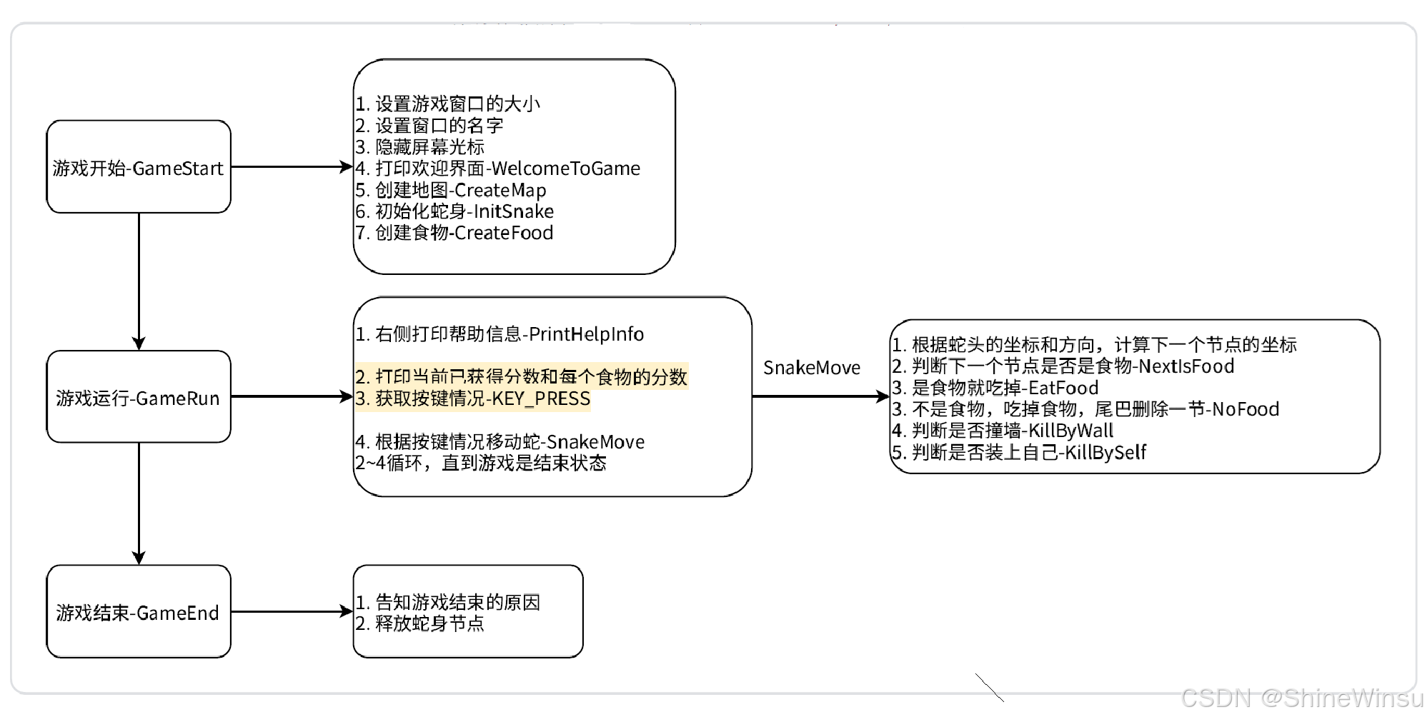 (游戏主循环,处理输入、更新蛇的位置、判断碰撞等)、GameEnd