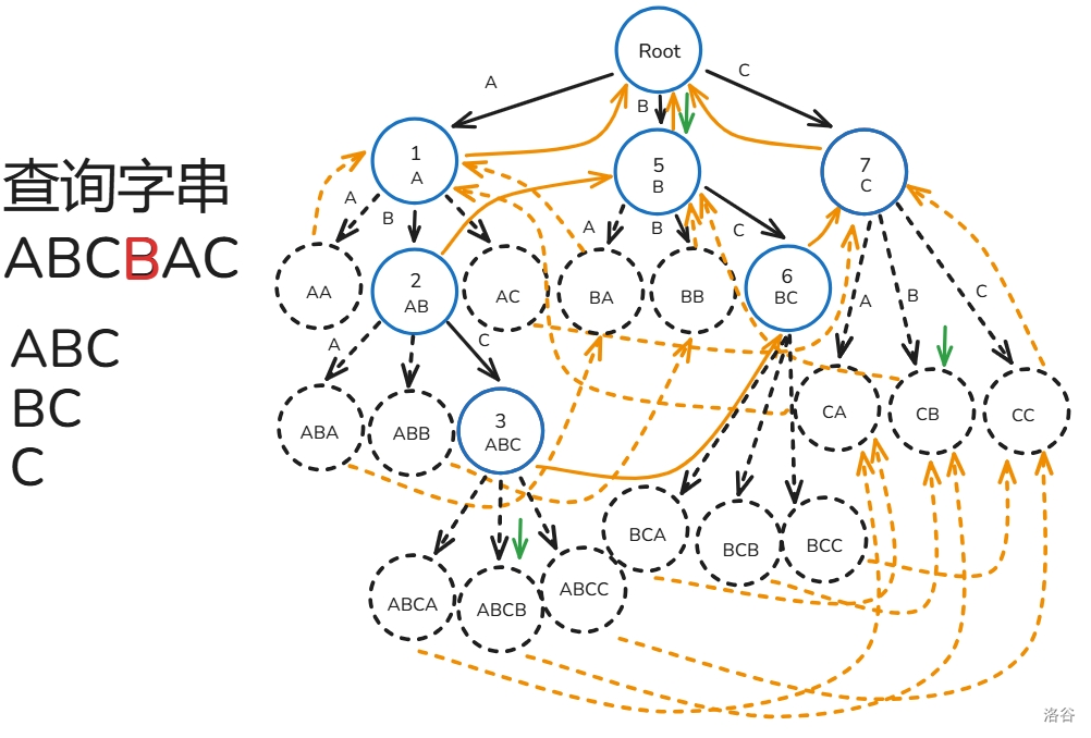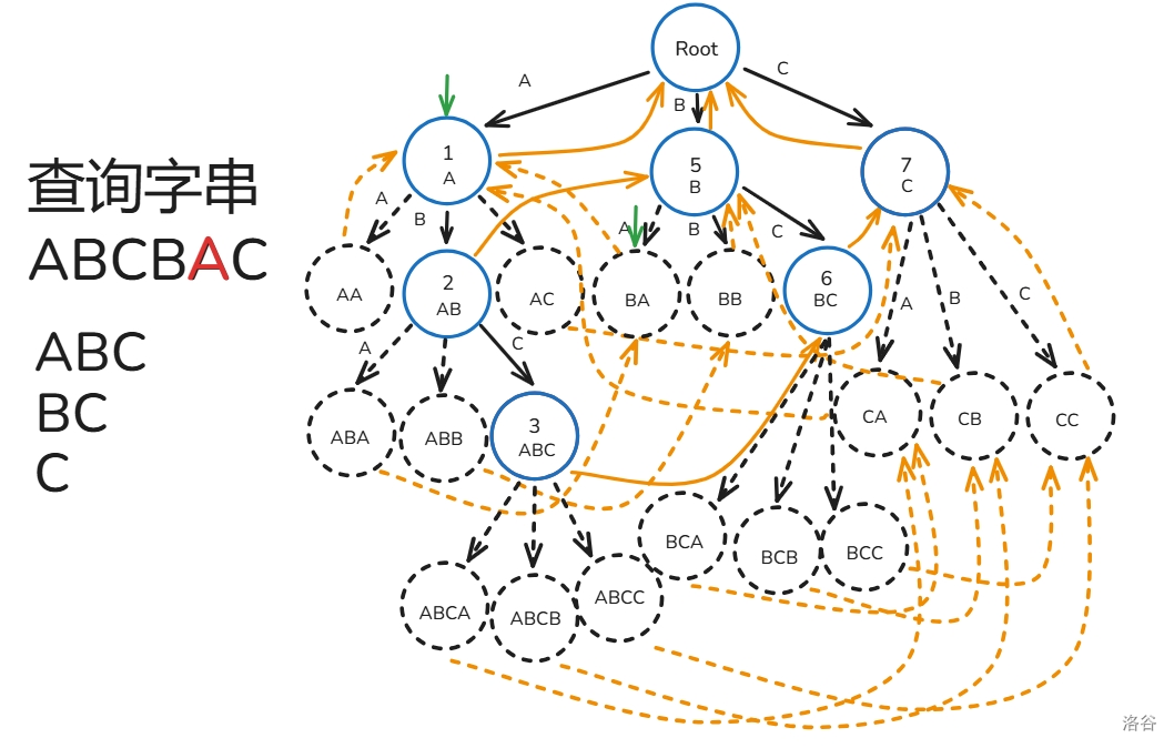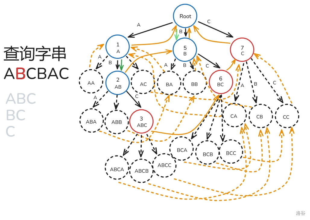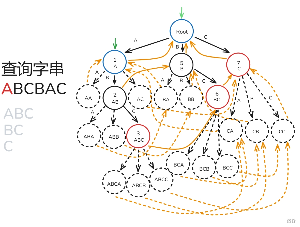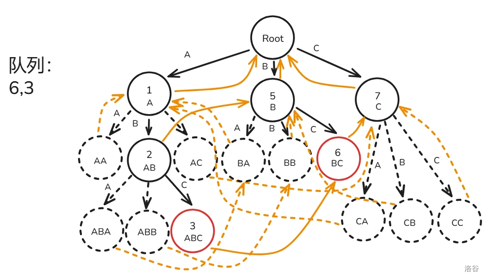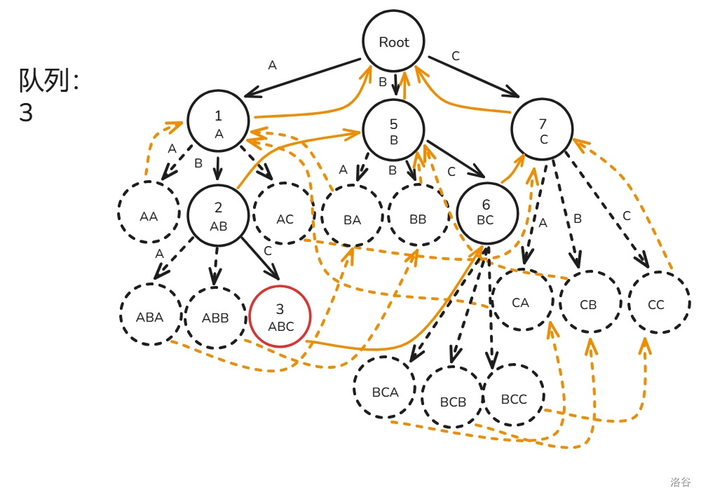 下面用图解 \(fail\) 指针建造过程(模式串只有 ABC 三种字符构成):