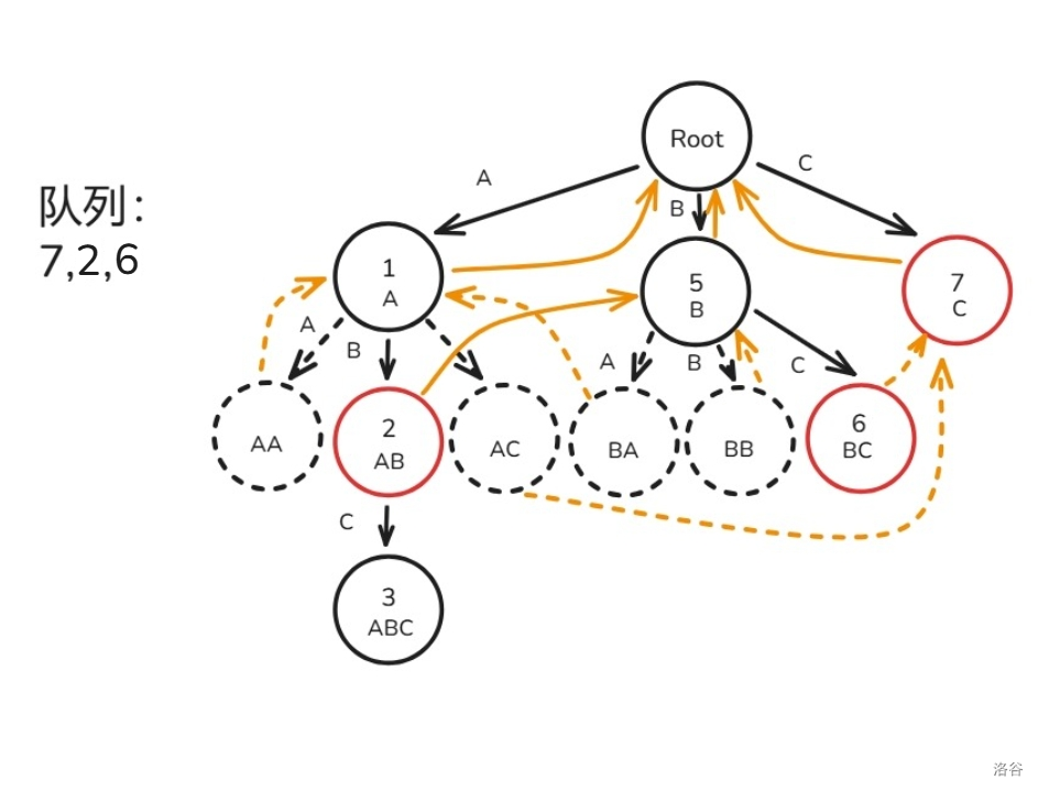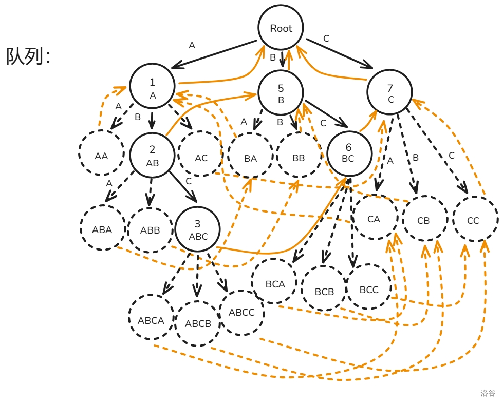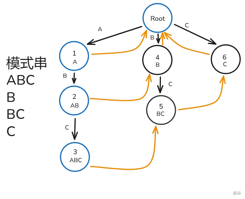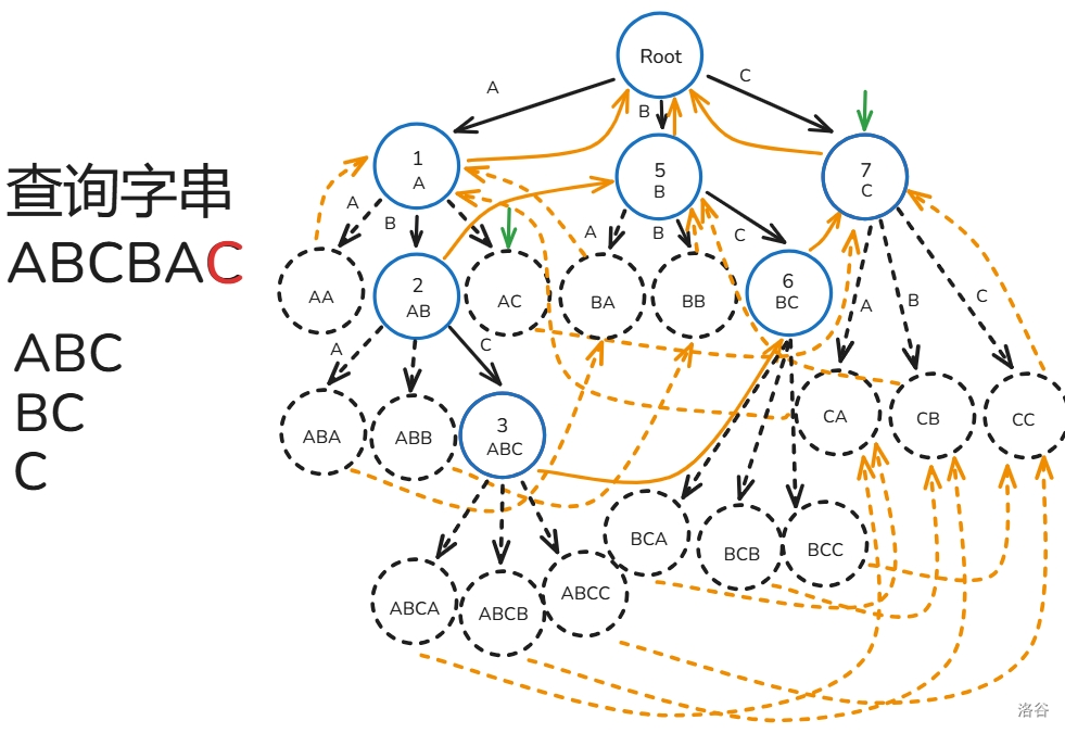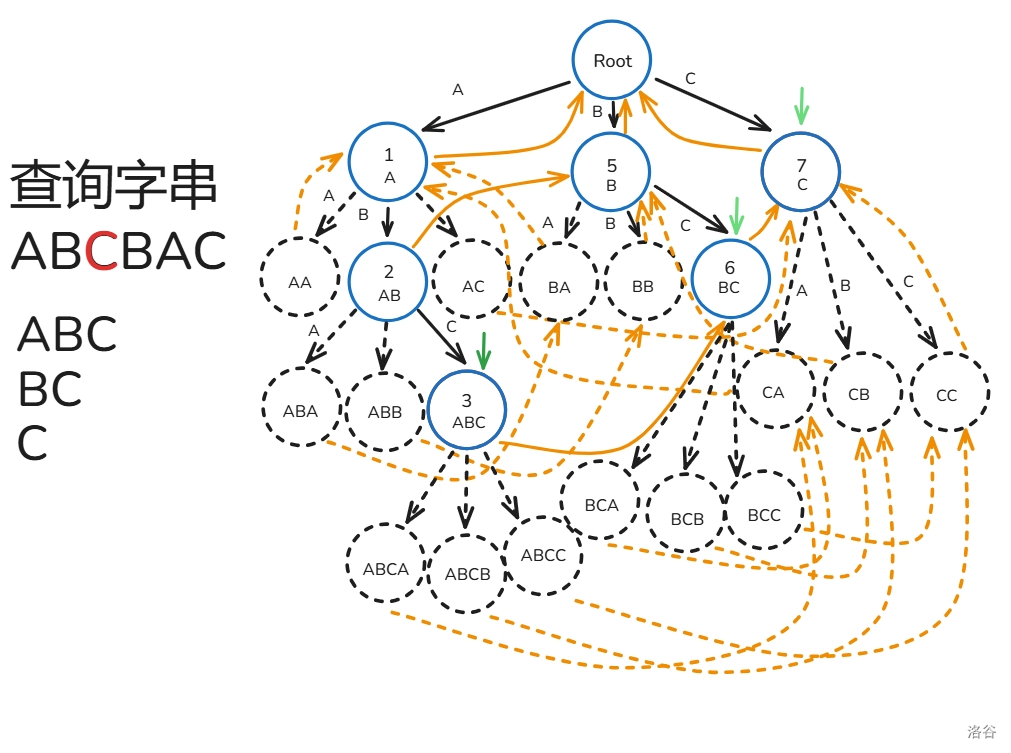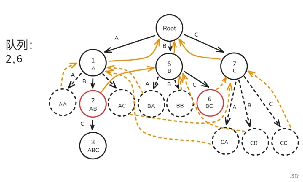 下面用图解 \(fail\) 指针建造过程(模式串只有 ABC 三种字符构成):