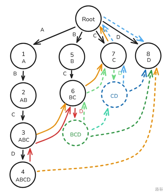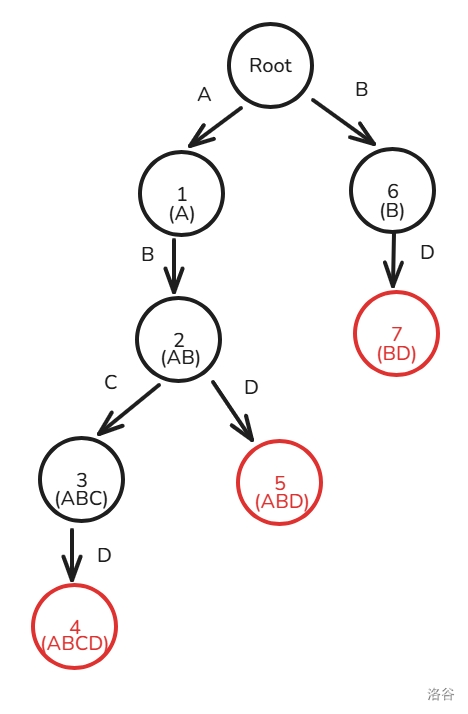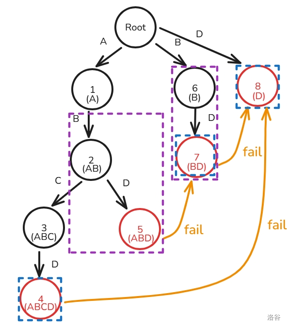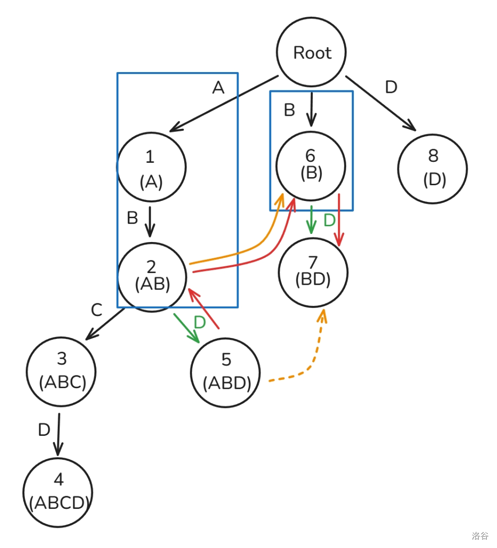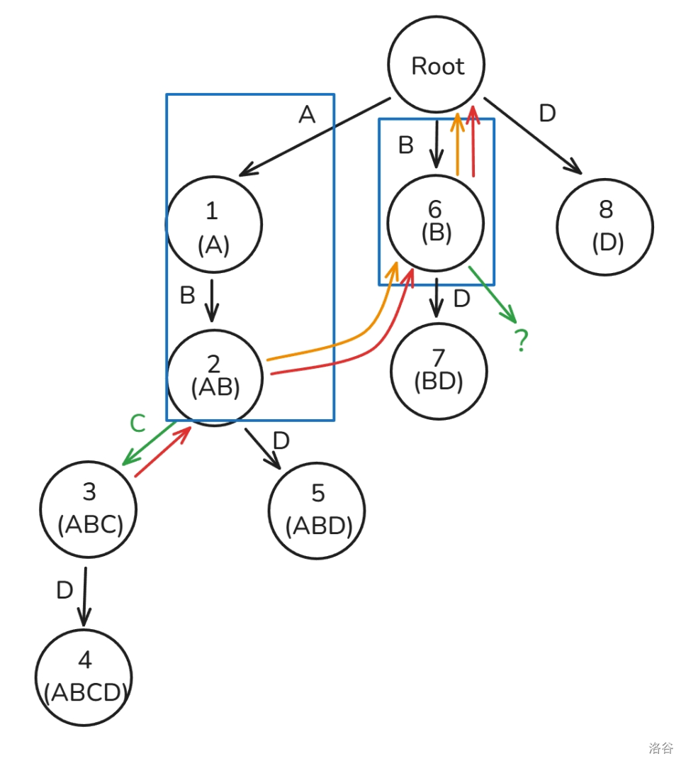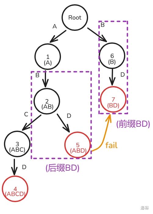因为节点 \(5\) 属于的子串为 ABD,节点 \(7\) 属于的子串为 BD 且是图中所有最长的后缀(当然也只有它一个),所以 \(fail_5=7\)