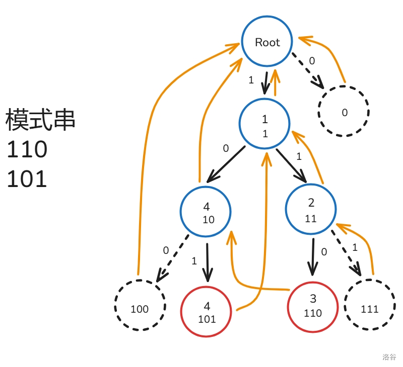void build_fail(){for(int i:{0,1})t[0].son[i]=1;t[1].fail=0;queue<int>q;q.push(1);while(!q.empty()){int tmp=q.front();q.pop();for(int i:{0,1}){if(!t[tmp].son[i]){t[tmp].son[i]=t[t[tmp].fail].son[i];continue;}t[t[tmp].son[i]].fail=t[t[tmp].fail].son[i];t[t[tmp].son[i]].flag|=t[t[t[tmp].fail].son[i]].flag;q.push(t[tmp].son[i]);}}return;