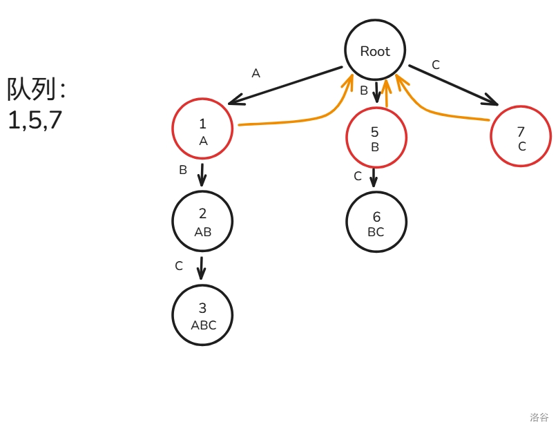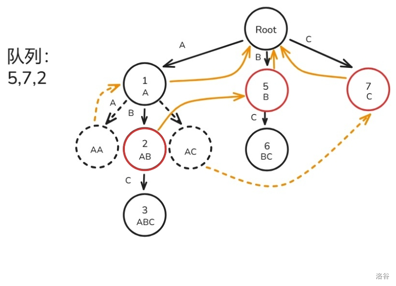 1. 将根节点的所有子节点入队,根节点的虚拟节点的 \(fail\) 都指向根。