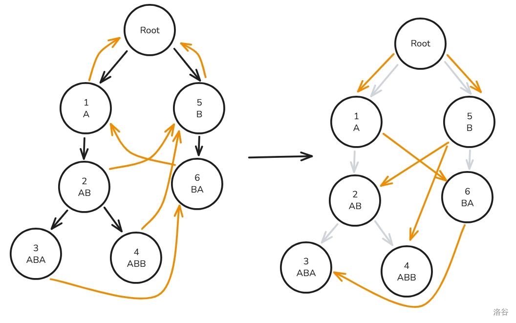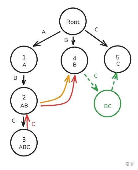 但是,如果一直暴力跳 \(fail\),复杂度最坏是 \(O(n)\) 的,我们如何才能优化呢?我们可以建若干个虚拟节点,而这个节点指向它的 \(fail\)