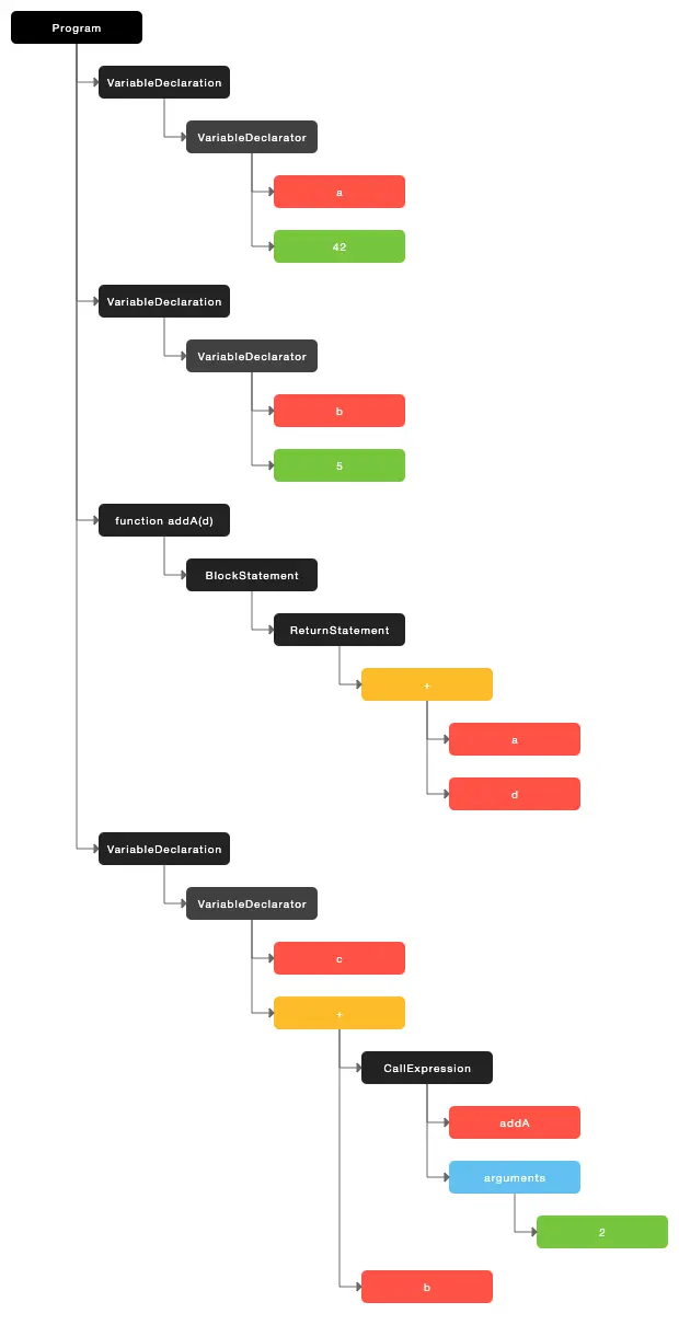 • 语法分析(Parsing):根据 JS 语法规则,将 Token 序列组装为抽象语法树(AST)——AST 是一种树形结构,直观反映代码的语法逻辑(如变量声明、表达式运算、函数调用的层级关系)。