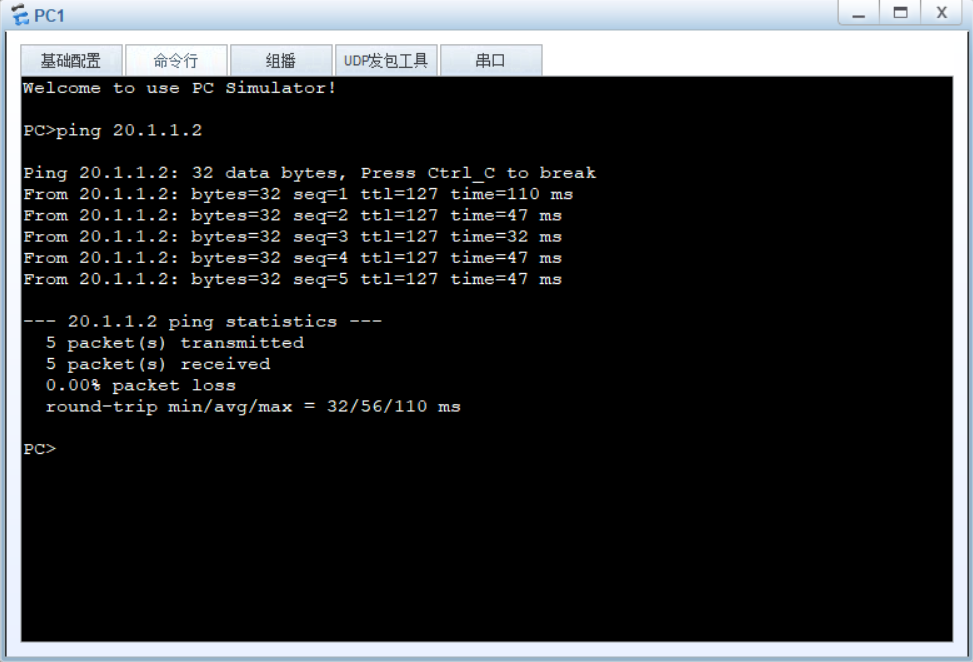 完成上述执行之后,我们便能够实现了PC1和PC2不同网段、不同VLAN的信息连通了,相比前面我们使用到的单臂路由要简单的多,但同时又达成了相同的结果。接下来试试从PC1向PC2发送信息,检测网络的连通性吧。