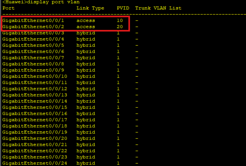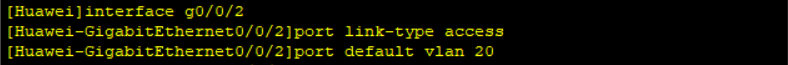 如上图所示,将GE 0/0/1接口划分进入VLAN 10,将GE 0/0/2接口划分进入VLAN 20。