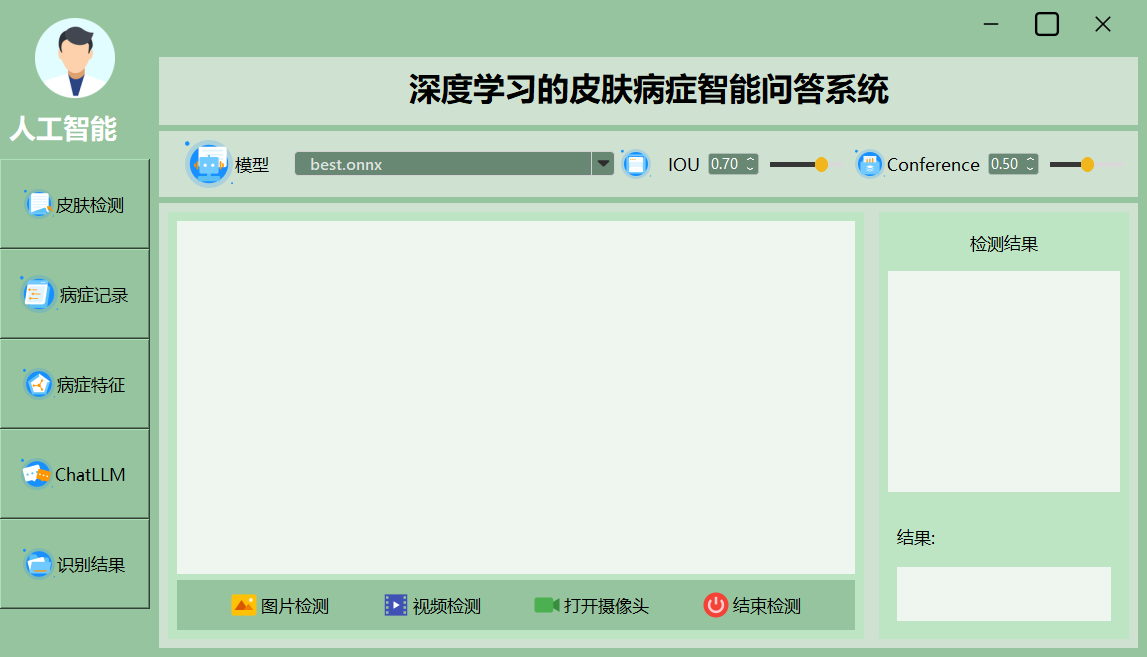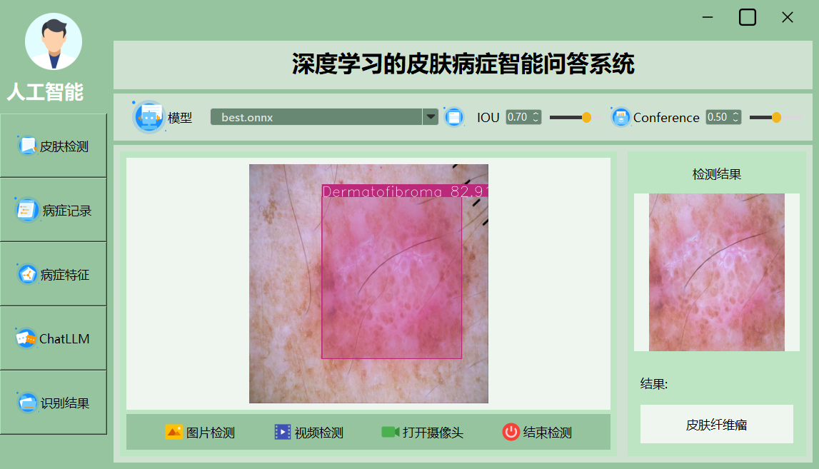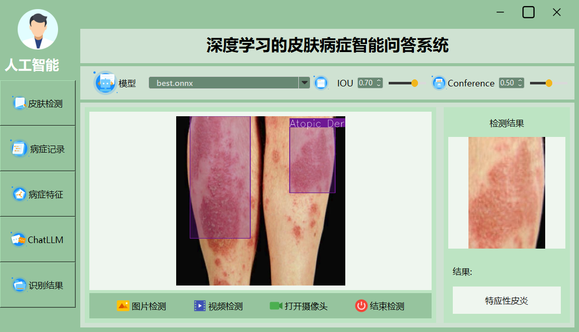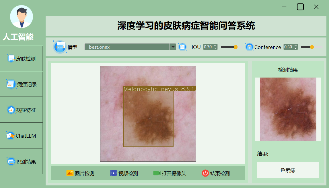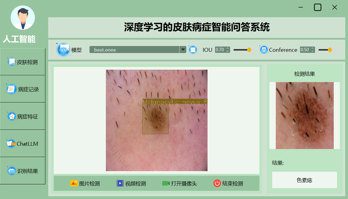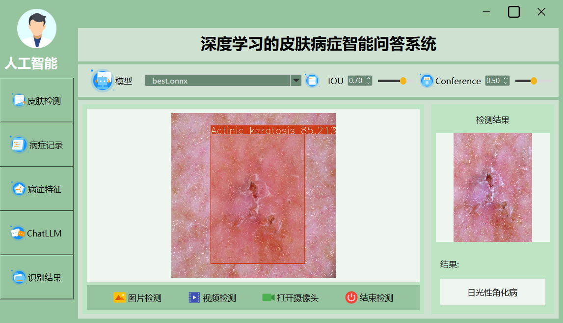 该界面展示了一个深度学习皮肤病智能诊断系统的主界面,集成了模型选择、检测精度调整和实时检测等功能,用户可通过直观的操作进行图像、视频检测及结果展示。