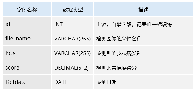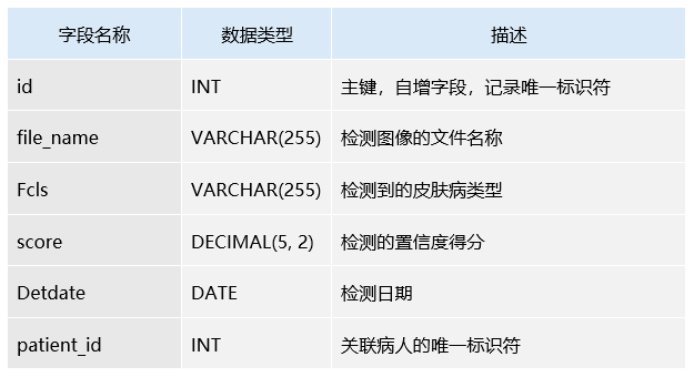该表用于存储每次皮肤病检测的详细记录,包含图像、检测到的皮肤病类型、检测得分及检测日期。