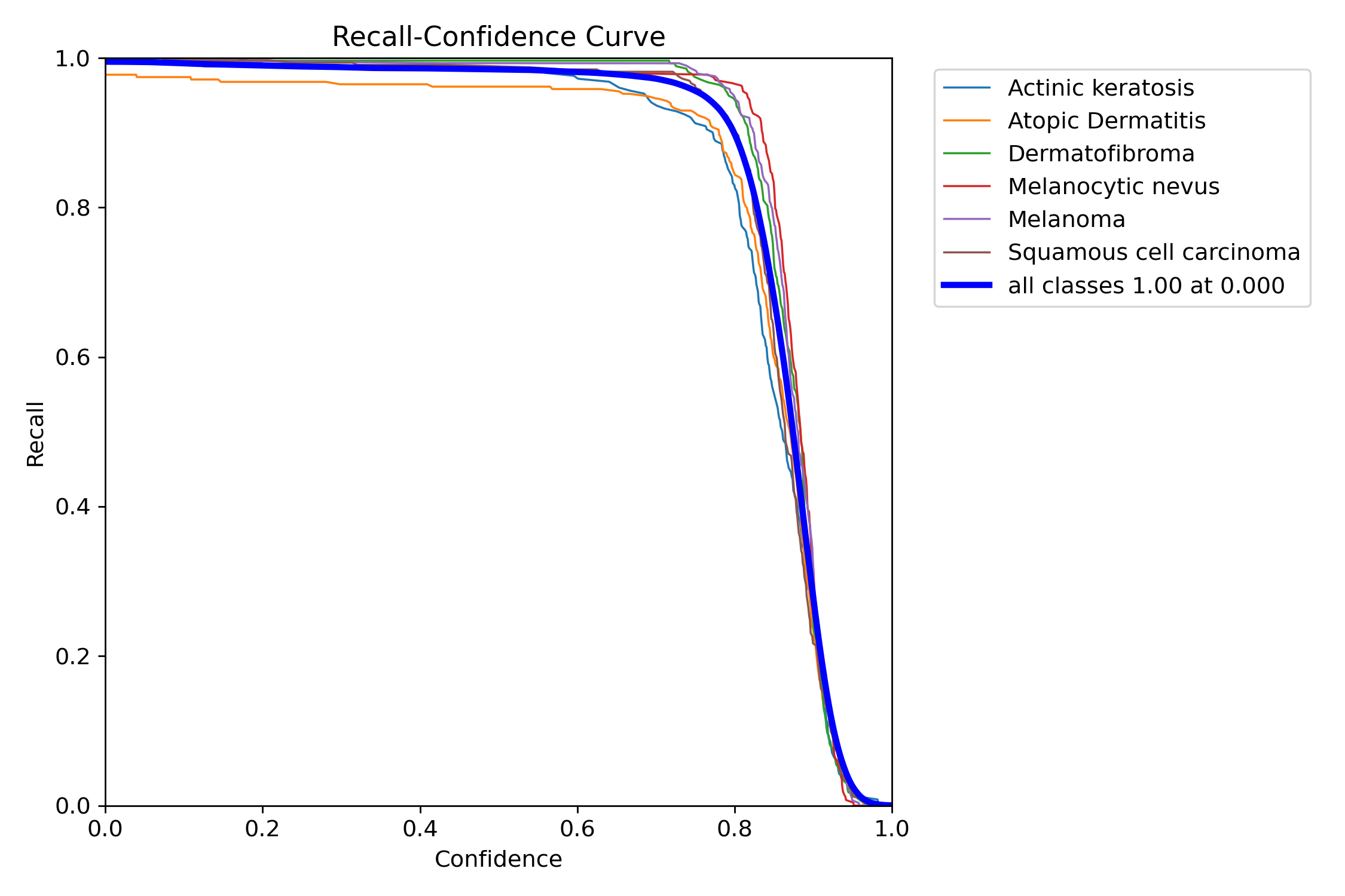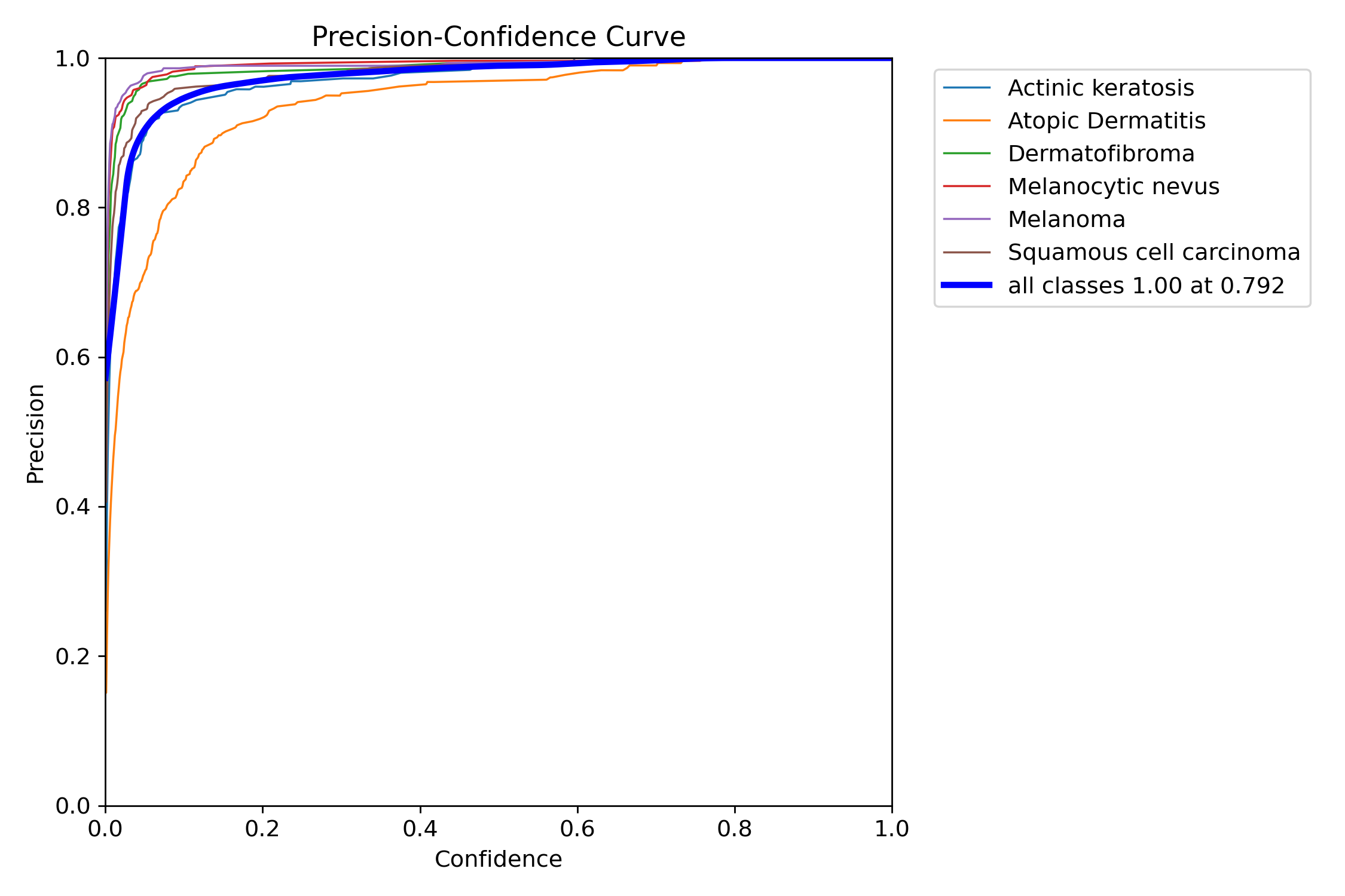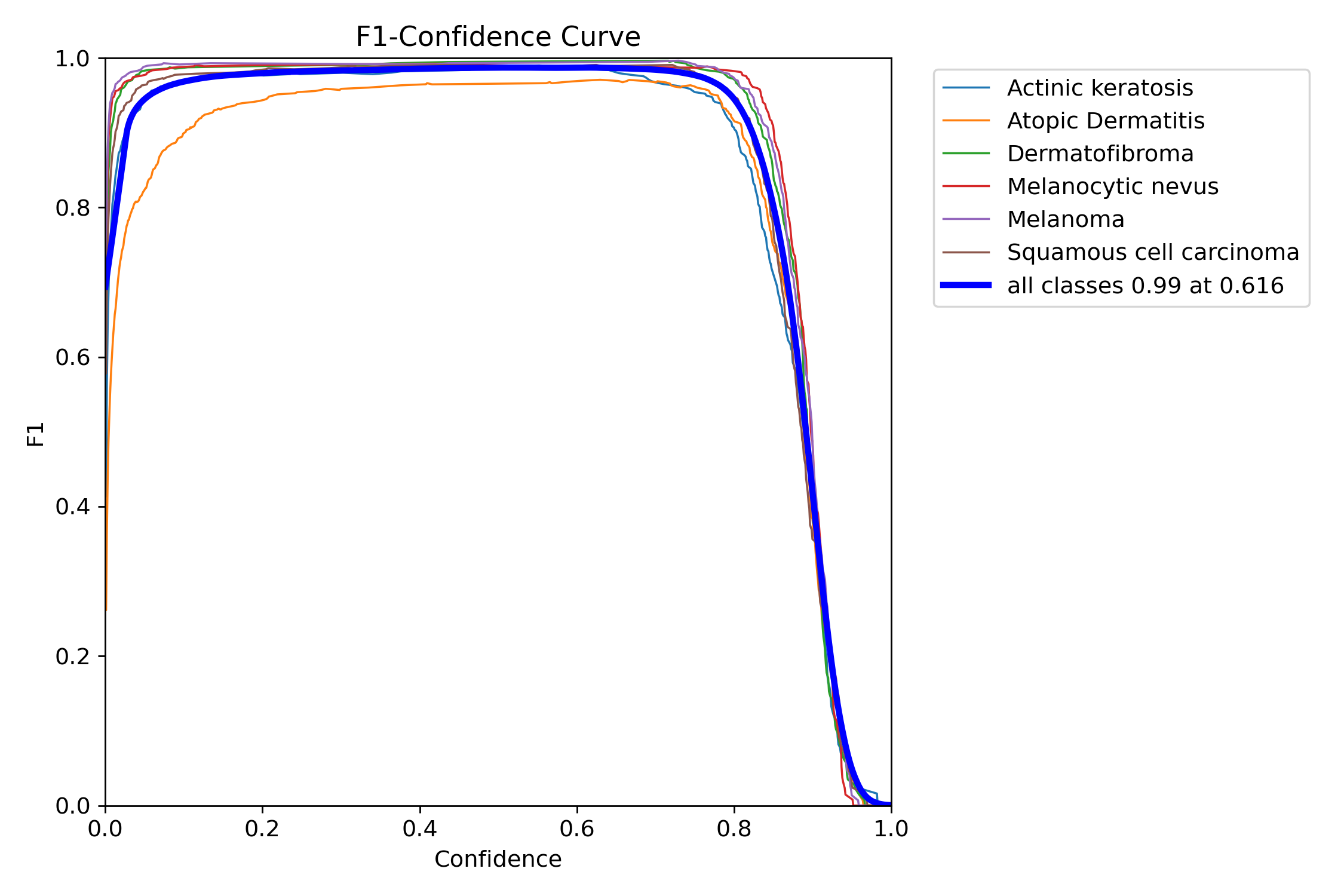 分析:这张图展示了不同类别的F1得分随置信度变化的曲线,表明随着置信度的提高,模型在所有类别上的预测表现趋于稳定,并且在高置信度下表现最佳,尤其是“日光性角化病”类别。