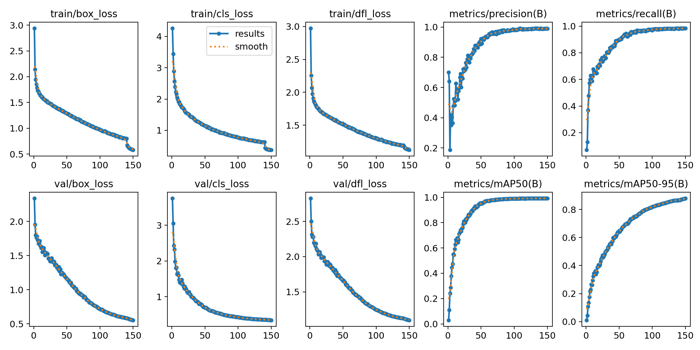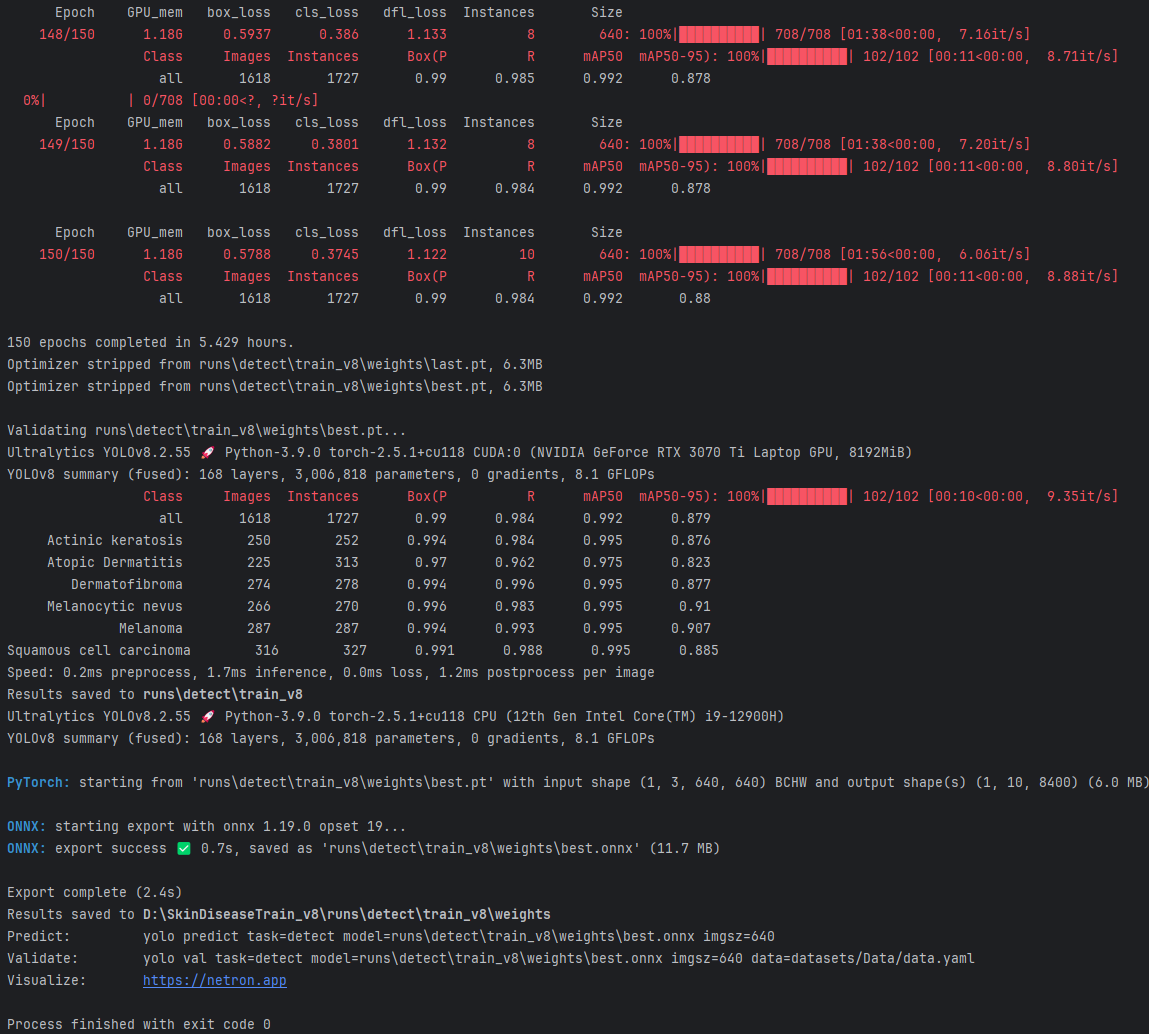 在mAP50-95上表现优异(接近100%)。推理速度保持在1.7毫秒左右,后处理时间为1.2毫秒,显示了较高的处理效率。此外,模型在多个类别上的精度和召回率也达到了很高的水平。就是从该日志输出来看,模型在训练过程中表现良好,达成了150个epoch,并且在验证集上取得了不错的结果,特别