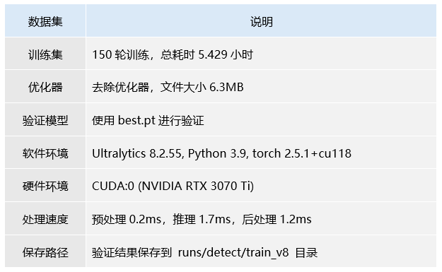 简而言之,模型在训练和验证阶段都表现出色,并且具备较高的推理效率。