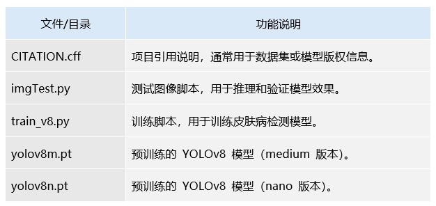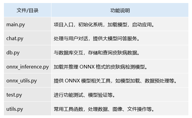 这些文档具备了项目的主要能力实现,如皮肤病检测模型推理、数据库操作、用户交互等。
