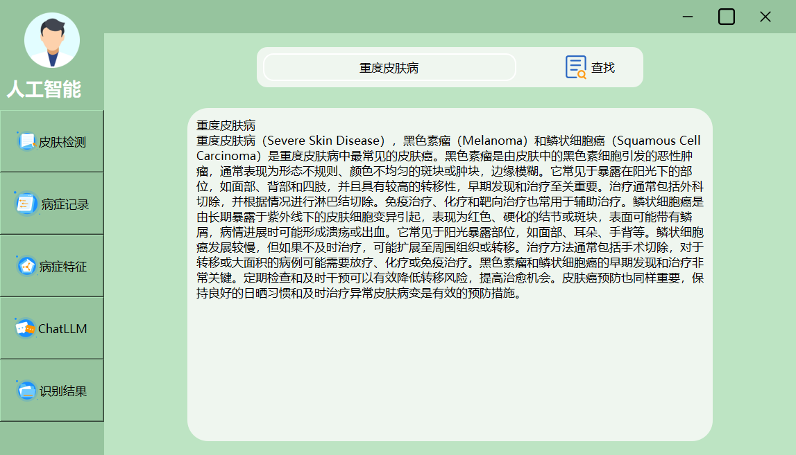 在系统运行流程中,用户第一通过图形界面上传待分析的皮肤病图像或输入相关症状描述。对于图像材料,系统将其传递至 YOLOv8 推理引擎,由模型自动搞定病灶区域的检测与分类,并输出定位框、类别标签及对应的置信度评分;对于文本输入,系统调用百度千帆大语言模型结合本地知识库,对用户的症状描述进行语义解析并生成诊疗建议。最终结果在界面上以图像标注和文本说明的形式同步呈现,既方便医生直观获取皮肤病灶的关键信息,也便于普通用户获得初步的就医参考,从而提升诊断效率与交互体验。