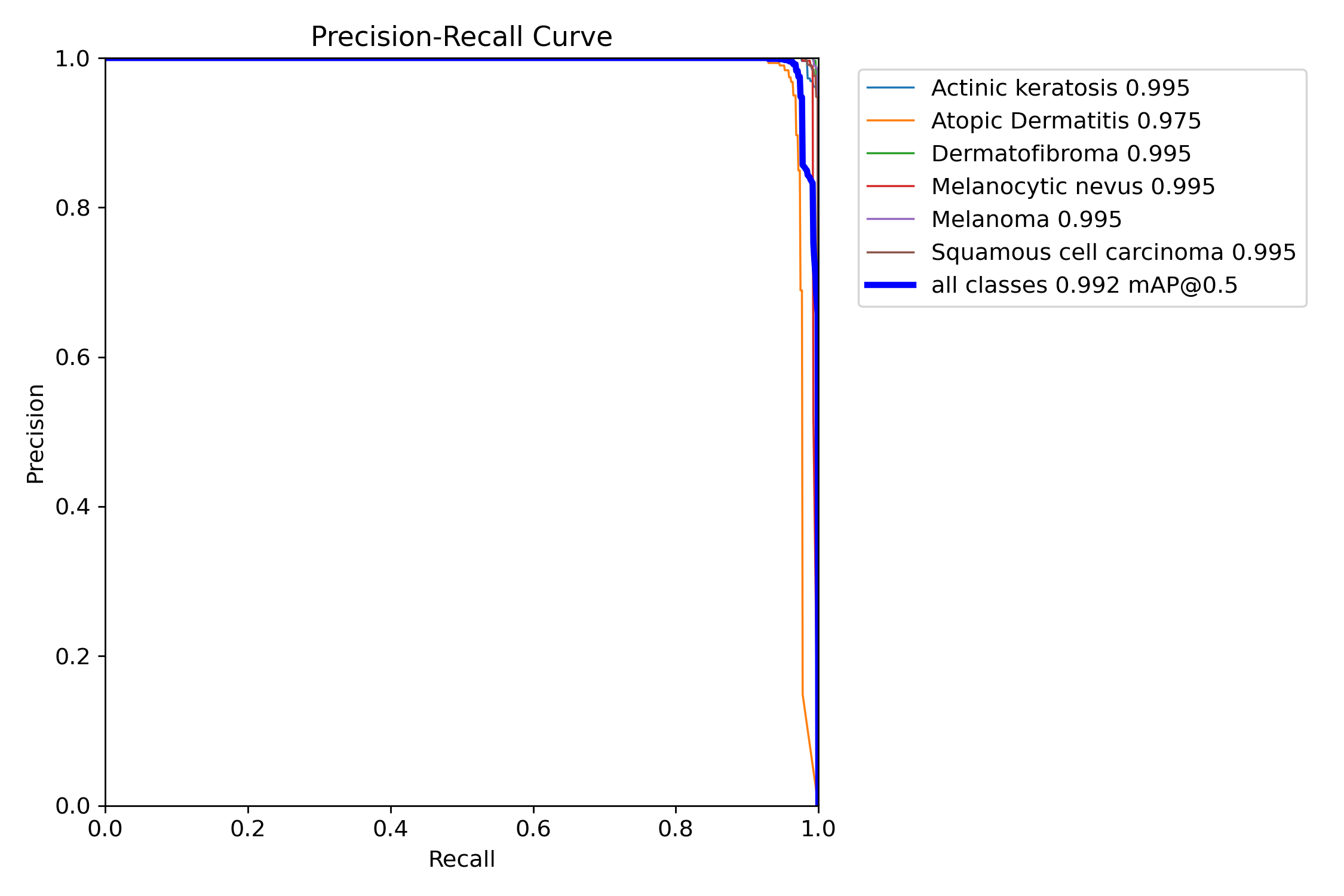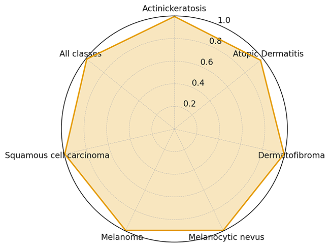 各类别在 mAP@0.5 指标上的表现均接近 1,说明模型在不同皮肤病检测任务中都具备较高的准确性和稳定性。