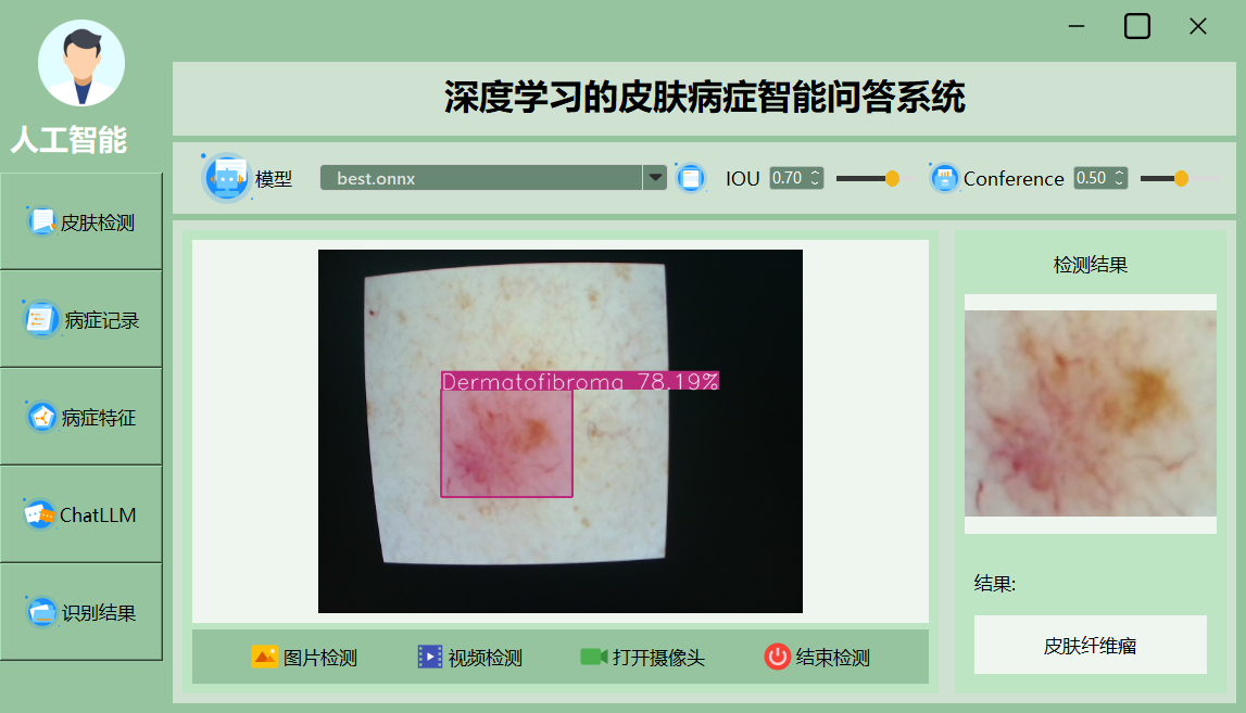 该界面展示了深度学习皮肤病智能诊断系统对皮肤病进行实时检测,成功识别出皮肤纤维瘤(Dermatofibroma),置信度为78.19%。