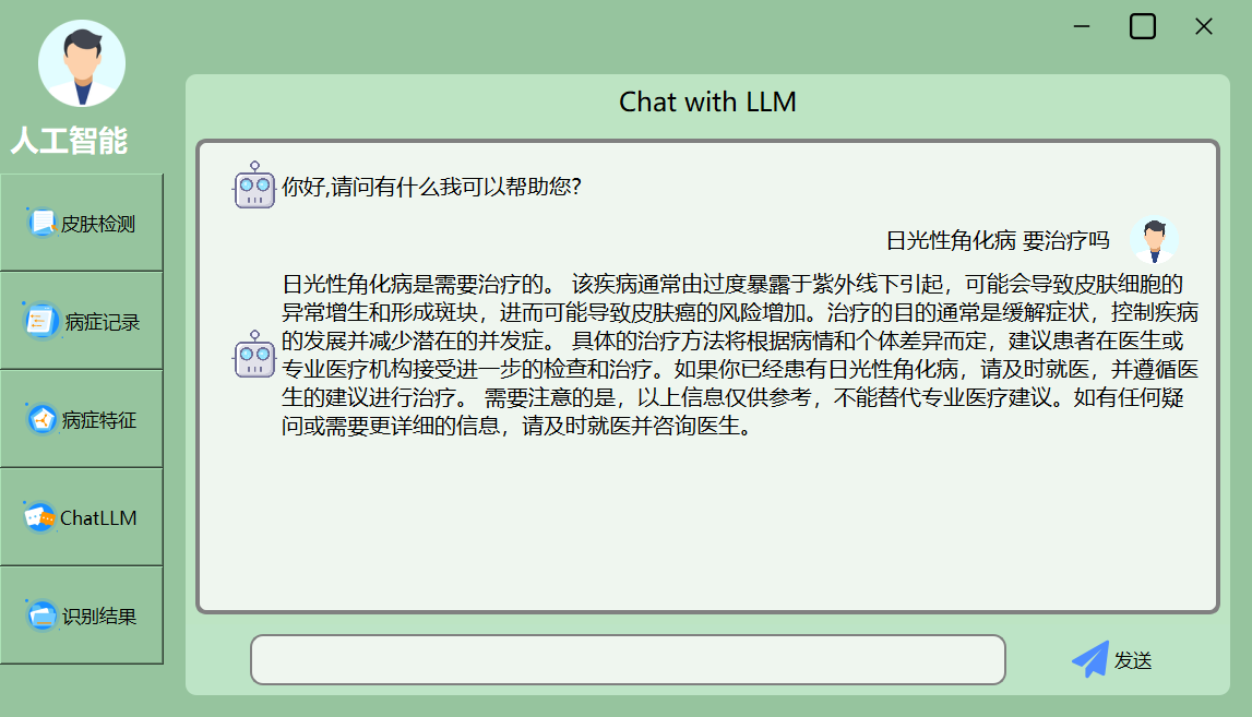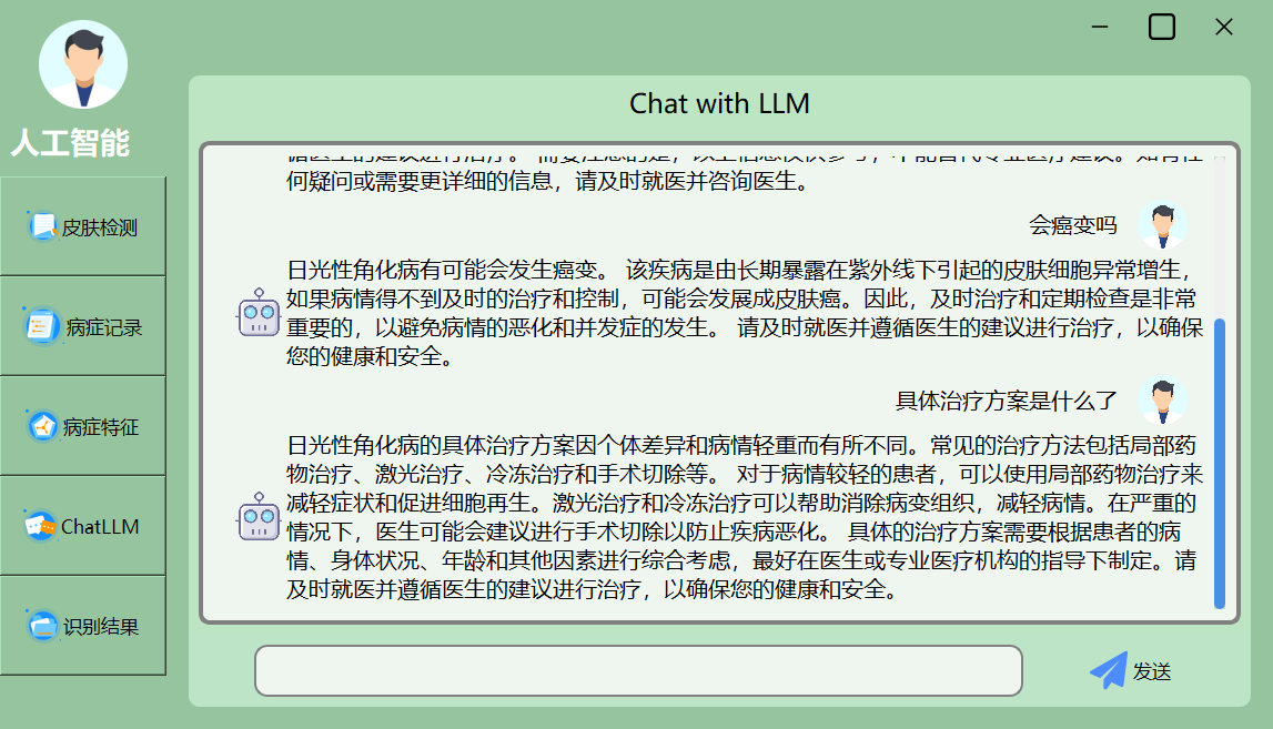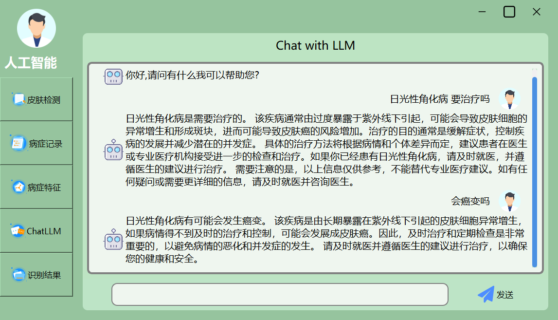 ChatLLM模块运用LangChain提供的预训练大语言模型(本计划启用的是百度千帆Yi-34B-chat),实现基于自然语言的问答能力。用户允许利用与模型进行对话,获取与皮肤病相关的详细信息、处理建议等。该模块通过将强大的自然语言理解能力与深度学习技术相结合,为用户提供智能化的查询与诊疗承受。