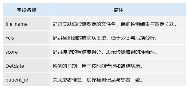 该表专注于存储与皮肤病种类相关的检测数据,可以记录不同类型的皮肤病及其相关置信度。