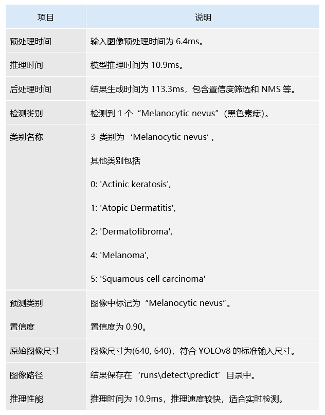 YOLOv8模型在推理过程中表现出良好的速度和高效性,能够快速且准确地识别皮肤病变图像中的“Melanocytic nevus”(黑色素痣),适合在医学影像分析中利用。