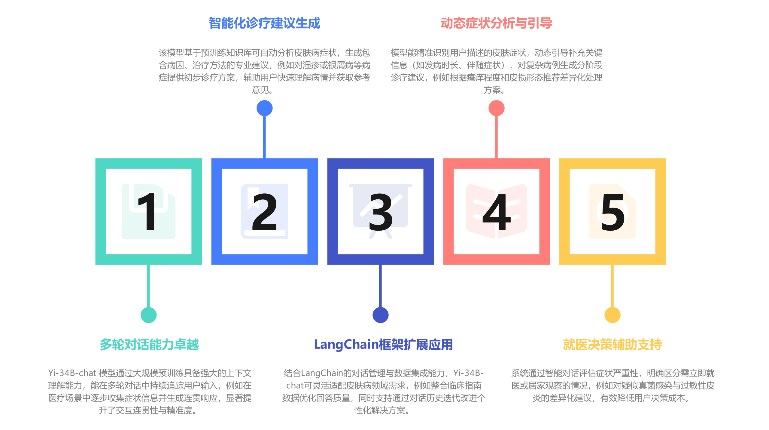 皮肤病智能问答:用户通过输入症状,Yi-34B-chat 模型能够分析并生成相关的诊疗建议、病因分析、治疗方法等。在皮肤病领域,此种能力尤为重要,源于它能够支援用户快速获取医学建议,特别是在初步诊断时给予专业的援助。
