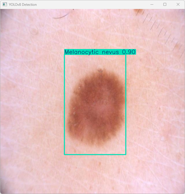 在这张图像中,YOLOv8模型成功识别出了“Melanocytic nevus”(黑色素痣),并为该区域给予了置信度评分为0.90,表明模型对该检测结果有较高的信心。边框准确地框住了病变区域,模型的表现良好,适合在医学影像分析中使用。