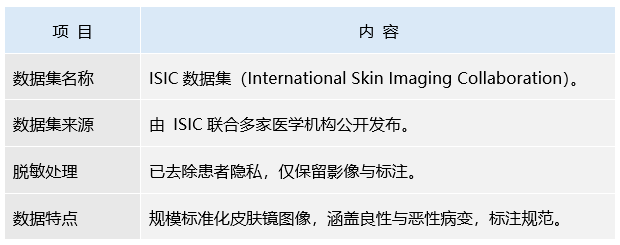 本体系所使用的皮肤病图像数据主要来源于 ISIC(International Skin Imaging Collaboration)数据库。该数据库由多家国际医学机构与研究组织共同建立,旨在构建大规模、标准化的皮肤影像资源,以推动人工智能在皮肤病辅助诊断中的研究与应用。
