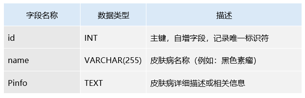 该表存储皮肤病的种类信息,提供详细的皮肤病描述,供系统查询和展示。