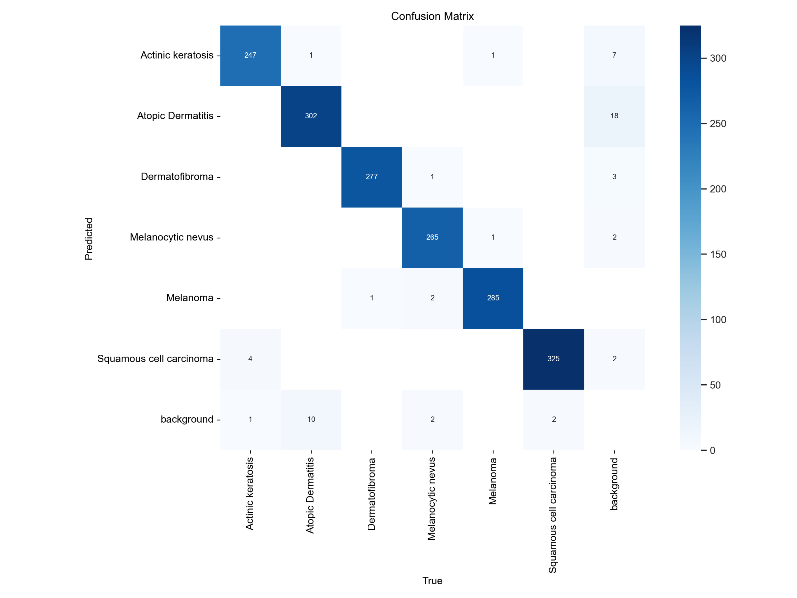 分析:这张混淆矩阵显示了模型在大多数类别上表现出色,但背景类的误分类较多,特别是在将背景预测为“Actinic keratosis”时。