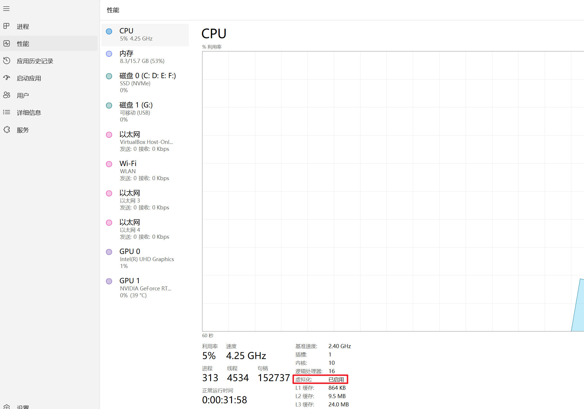 查看虚拟化是否开启,可在任务管理器→性能→CPU中查看虚拟化是否是开启状态。