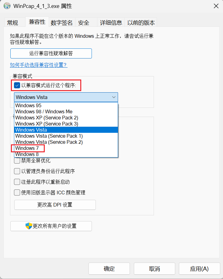 右键Winpcap--->选择属性--->兼容性--->勾选以兼容性模式运行该脚本--->下拉选择windows7