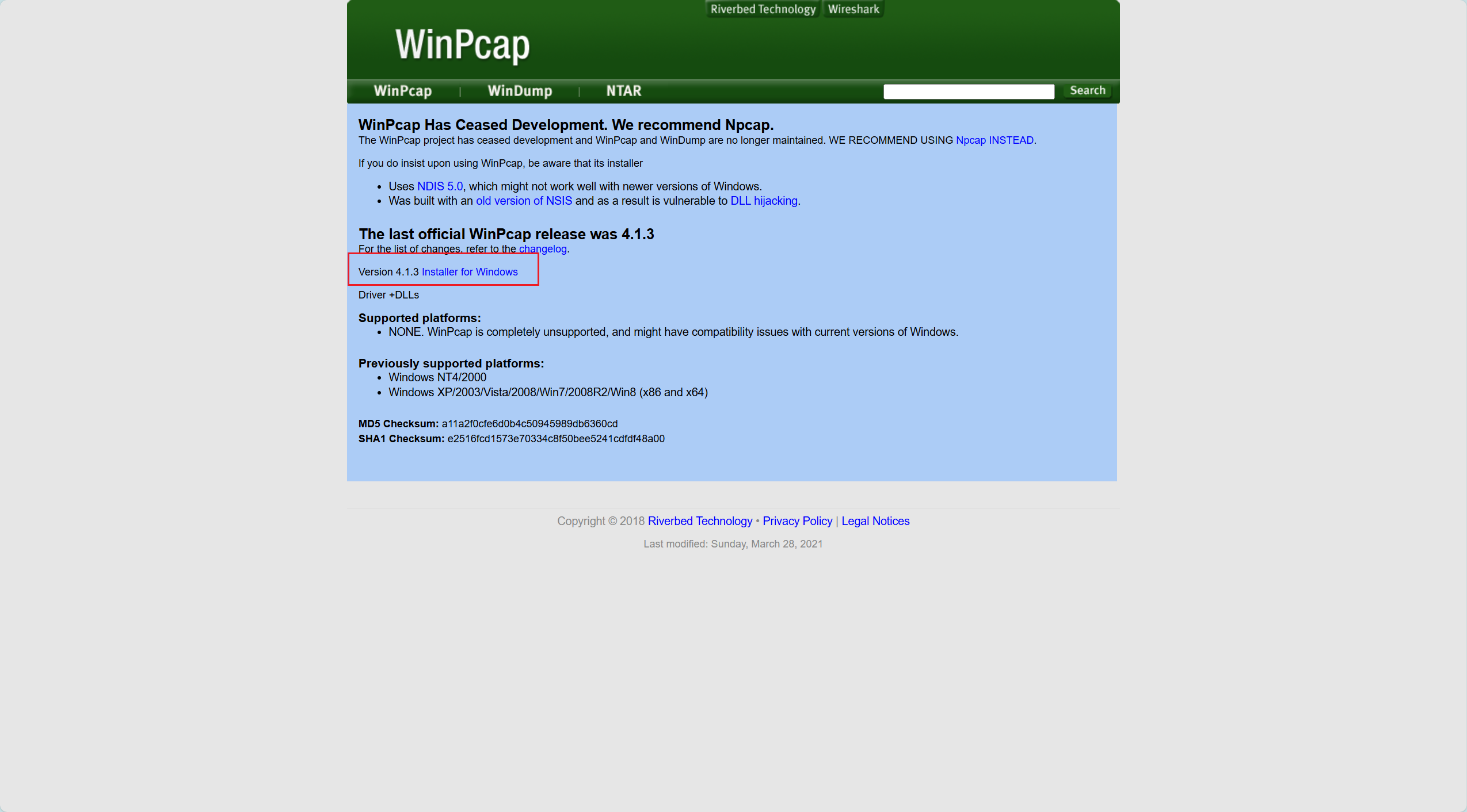 官方下载地址:WinPcap · Download