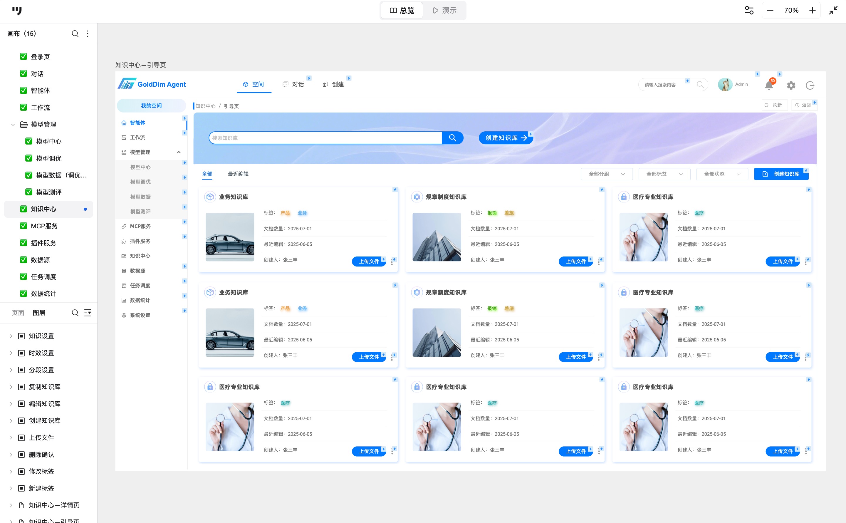 知识中心板块展示所有知识库,页面顶部有搜索栏和创建知识库按钮,下方以卡片形式展示知识库,含标签、文档数量、最近编辑时间与创建人。卡片上有“上传文件”功能。