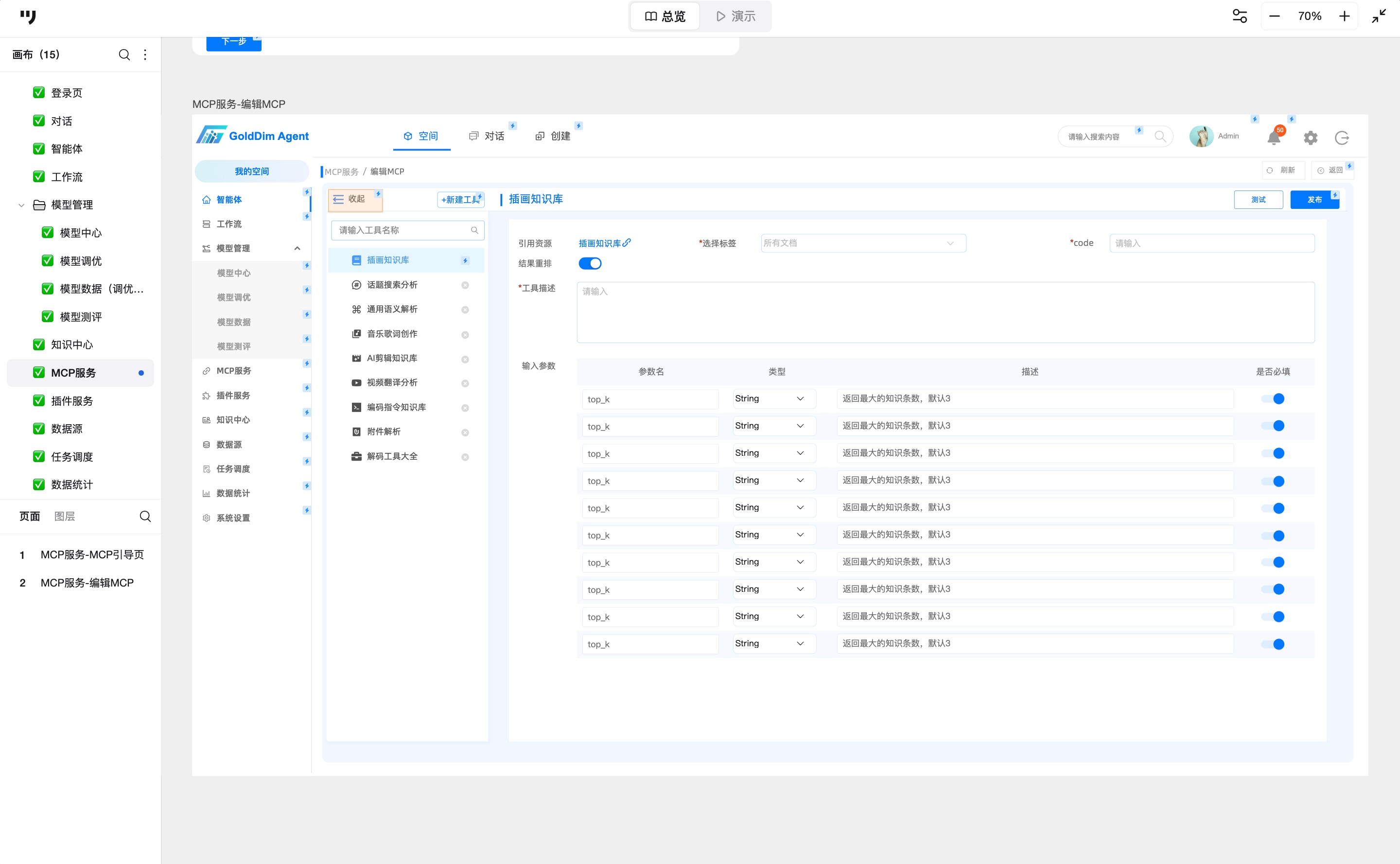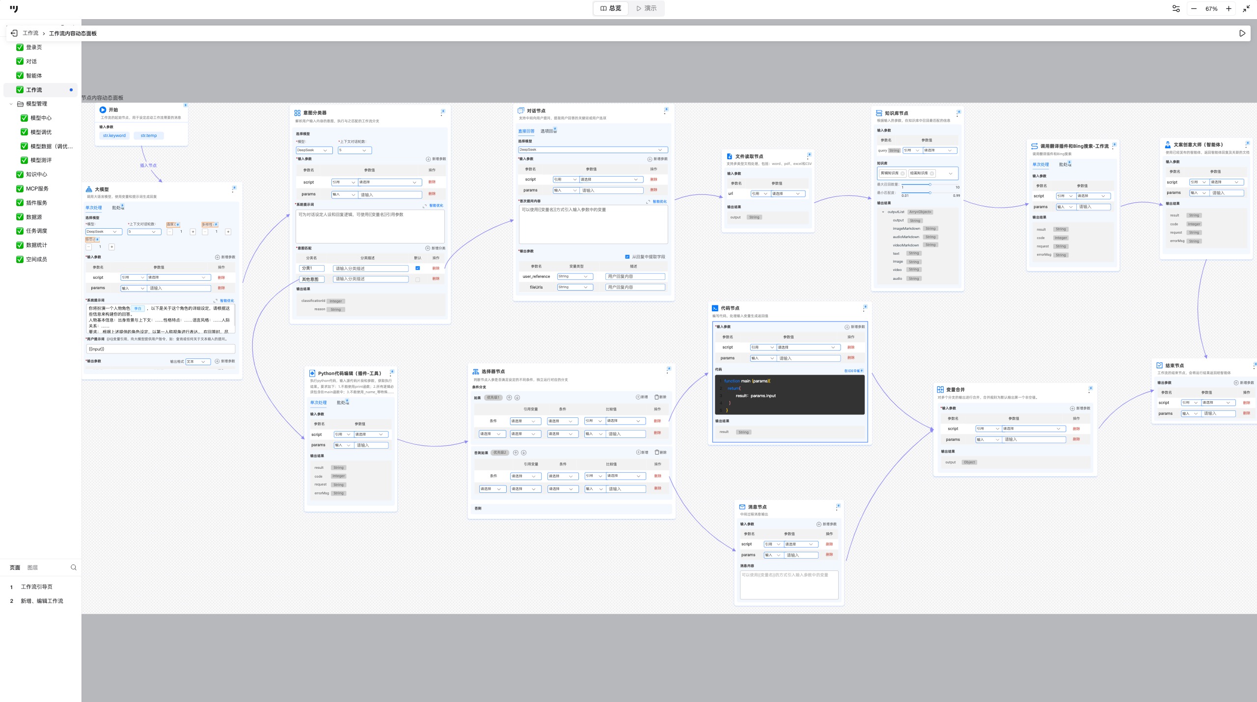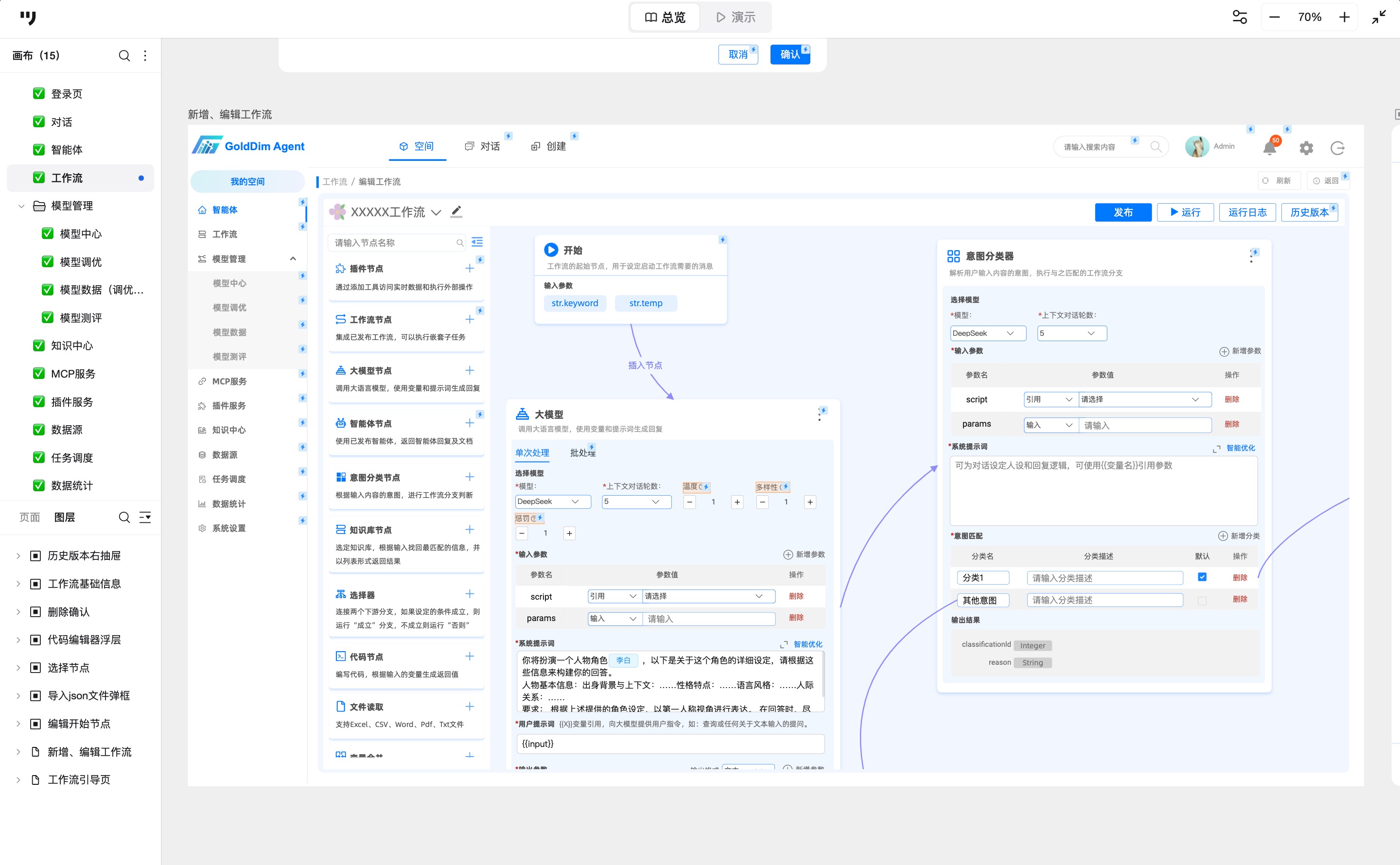 与传统后台不同,AI Agent通常得处理复杂的多轮逻辑。通过工作流面板,把大模型调用、意图分类、插件执行串联起来,可以清晰地描绘智能体的思考和执行过程,便于快速迭代和调试。