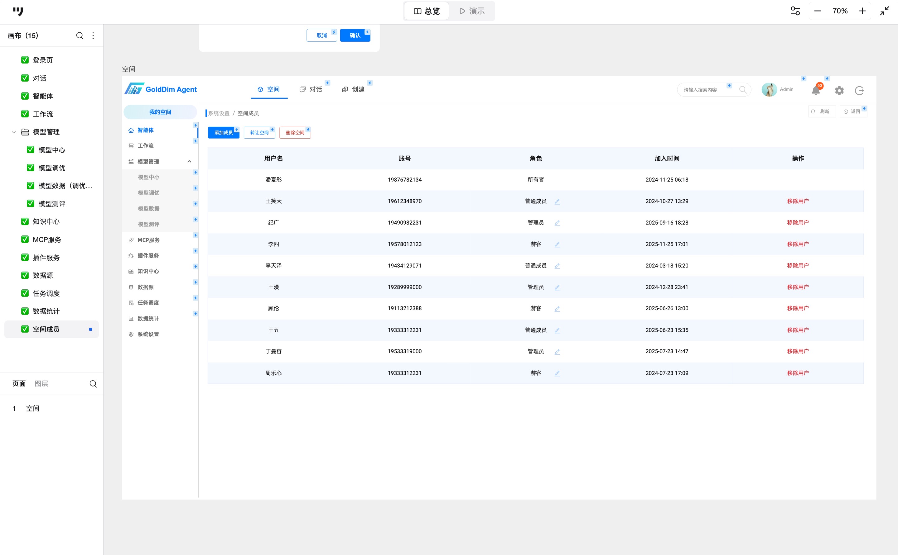 在系统设置模块,可进行成员与权限管理。页面顶部提供“添加成员”“转让空间”“删除空间”操作,下方为所有成员列表,含用户名、账号、角色、加入时间,支撑移除用户与团队管理操作。