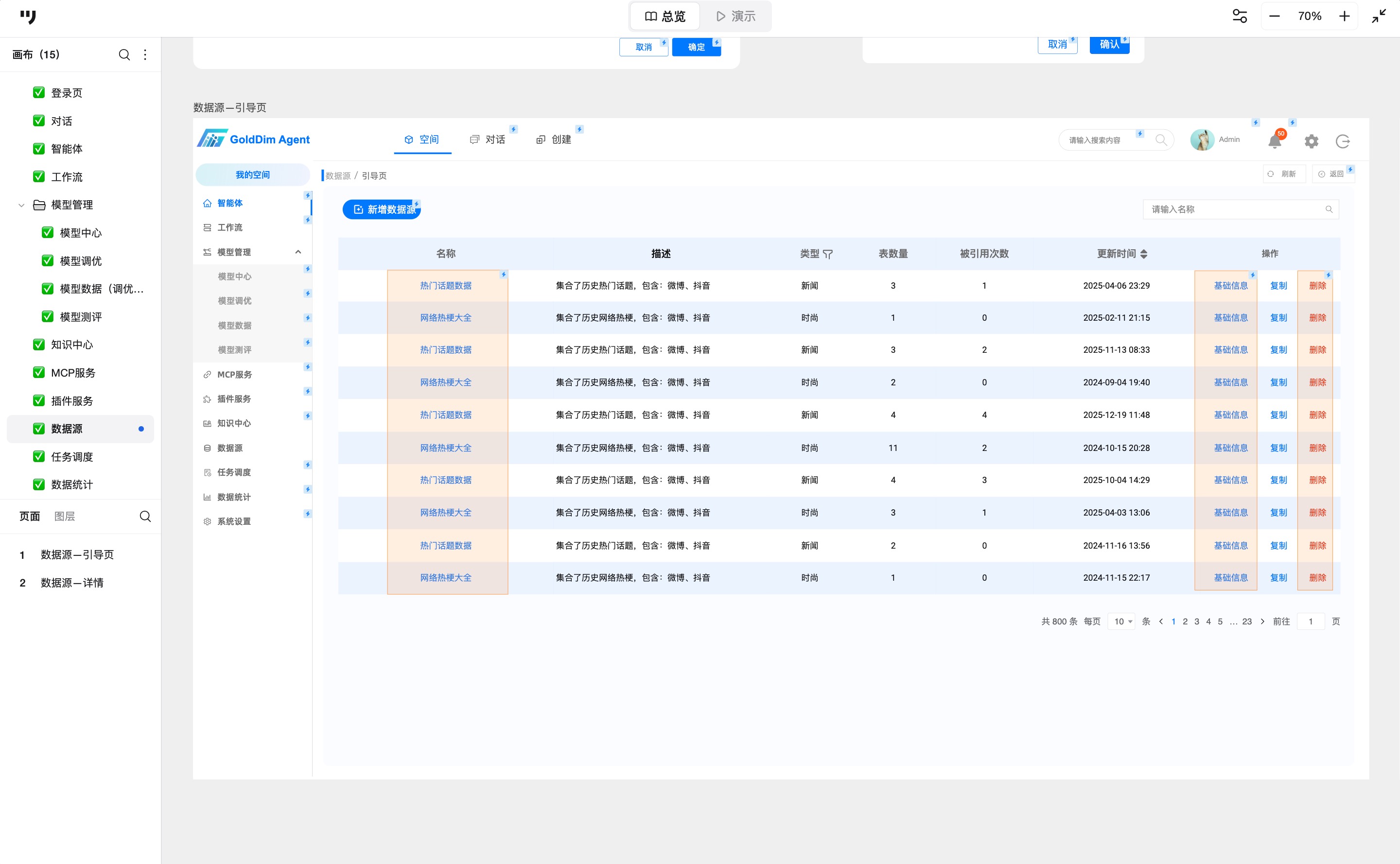数据源页面以列表形式展示数据源信息,含有名称、描述、类型、表数量、引用次数、更新时间,帮助编辑、复制、删除。点击数据源可进入详情页,帮助编辑数据表和导出。