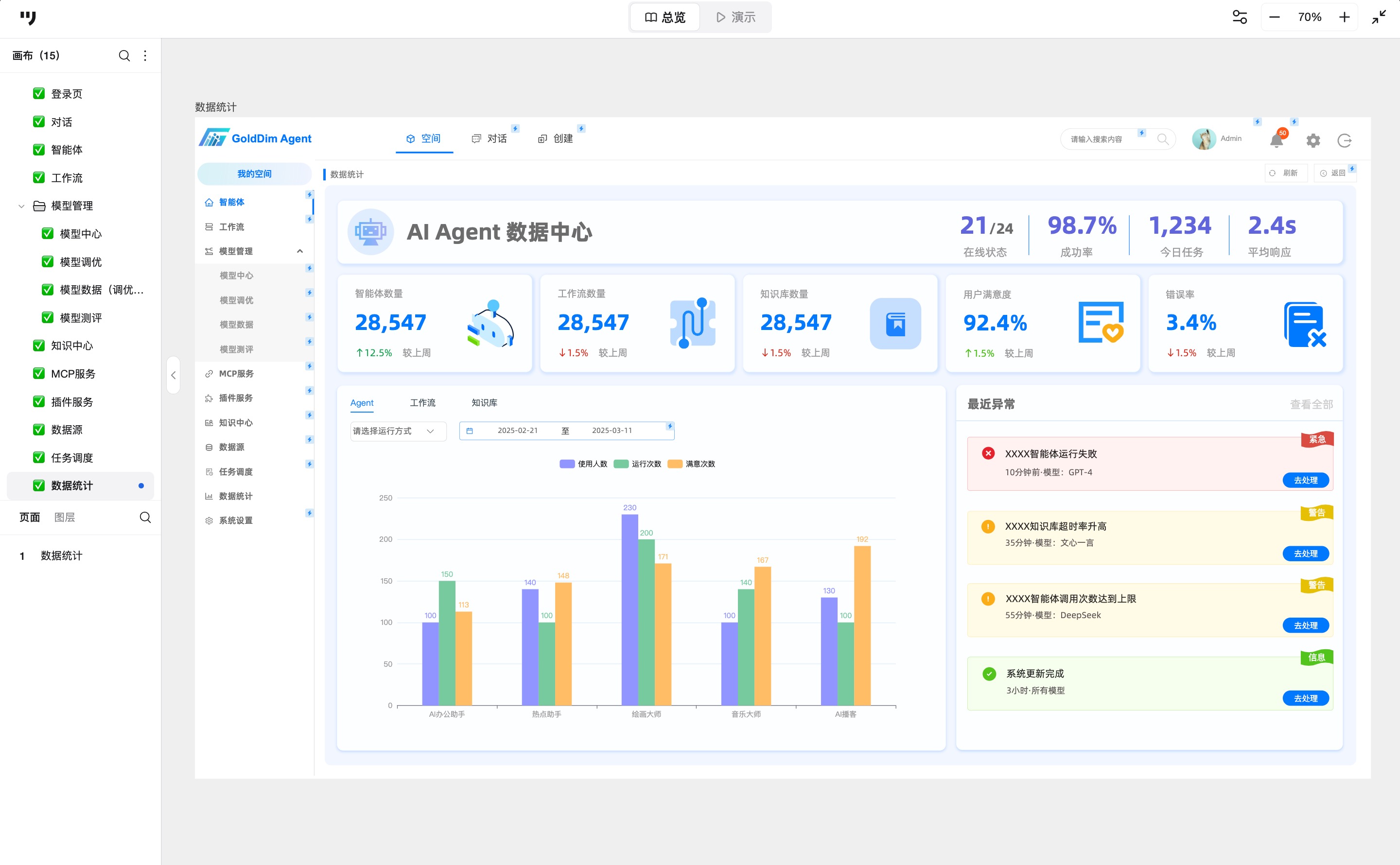 在数据统计页面,采用可视化图表展示核心数据。顶部为AI Agent在线状态、成功率、今日任务、平均响应时长。下方有五个数据卡片:智能体数量、工作流数量、知识库数量、用户满意度、错误率;下方左侧为Agent、工作流、知识库的运行和应用情况柱状图,右侧为最近异常消息提醒,按照紧急、警告、信息等优先级依次展示,承受飞快处理。