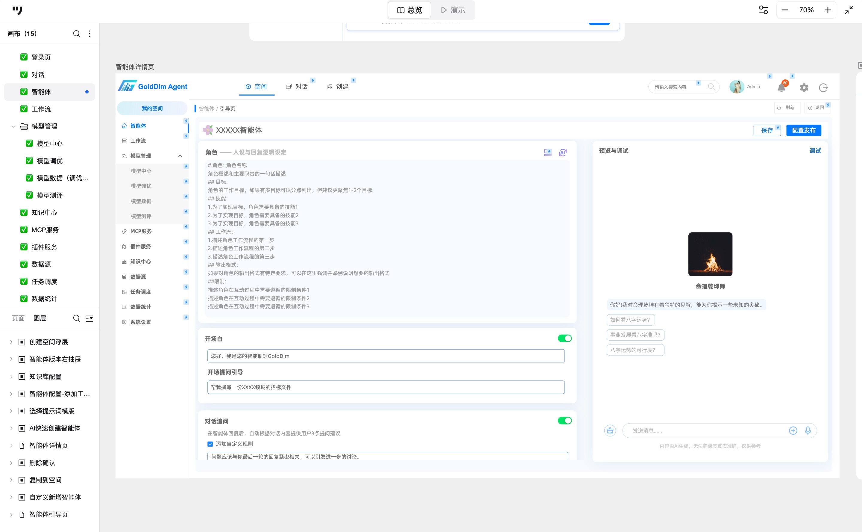 点击任意卡片进入详情页,左侧为设置执行区(角色设定、回复逻辑、开场白、提问引导、追问规则等),右侧为测试区,支持实时预览与对话体验。