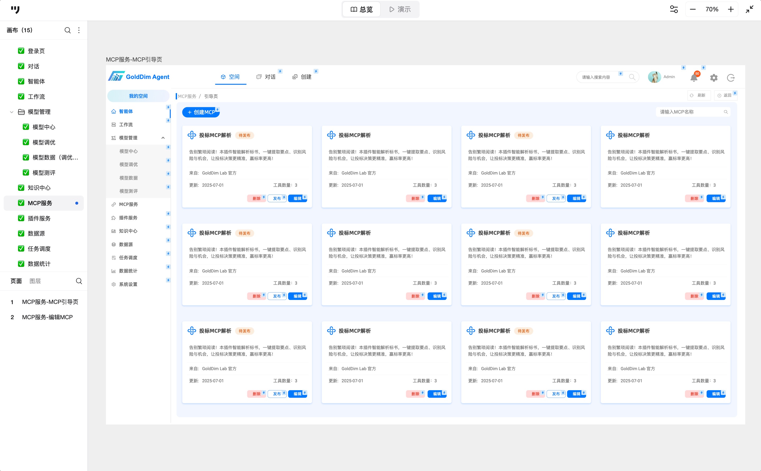 MCP服务页面顶部左侧为“创建MCP”按钮,右侧为搜索框;下方以卡片形式展示MCP服务,卡片标注状态标签如“待发布”,内容含简介、来源、更新时间、工具数量。卡片执行按钮包括删除、发布、编辑,分别用红色、白色、蓝色区分防止误操作。