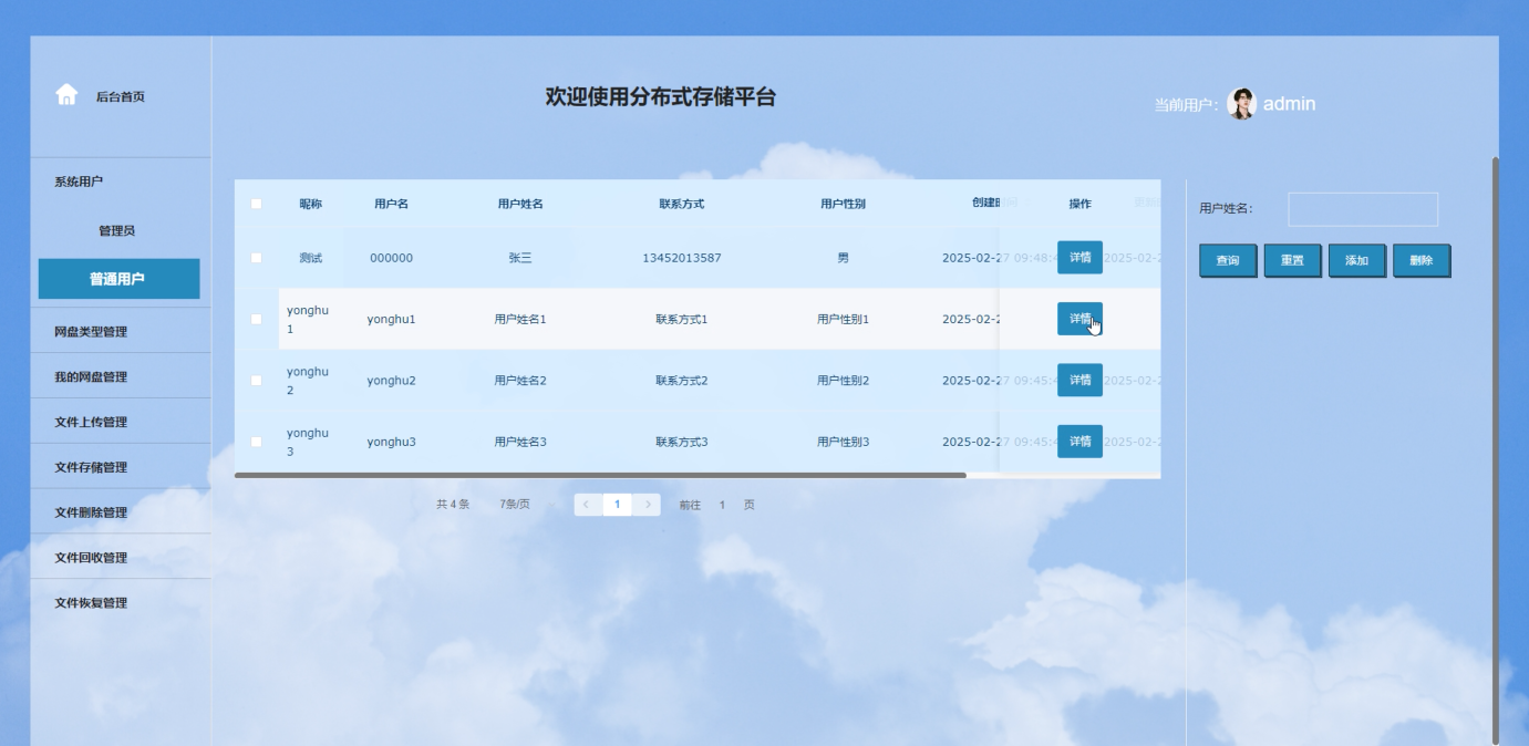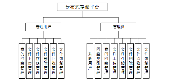 本系统旨在满足普通用户和管理员在分布式存储管理中的多样化需求,为用户提供高效、安全的文件管理服务。针对普通用户,系统提供文件上传、下载、删除、恢复及回收站管理等功能;而对于管理员,则增加系统用户管理、网盘类型配置以及全局资料监控等高级功能,确保系统的灵活性与可扩展性。功能描述具体如下: