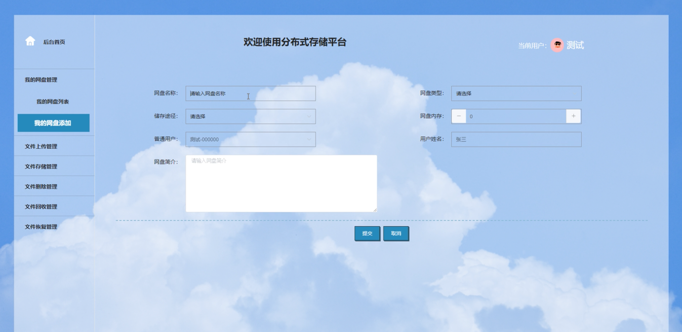 测试流程 | 点击我的网盘添加,填写信息 |