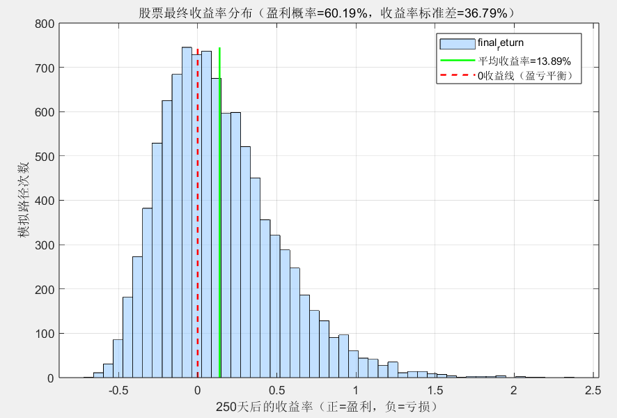 title(sprintf('股票最终收益率分布(盈利概率=%.2f%%,收益率标准差=%.2f%%)', win_rate*100, return_std*100));