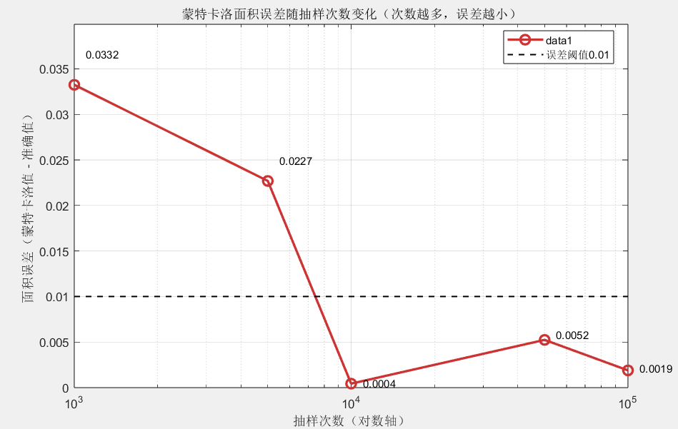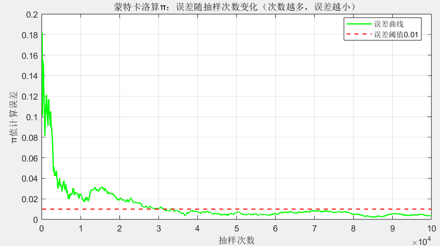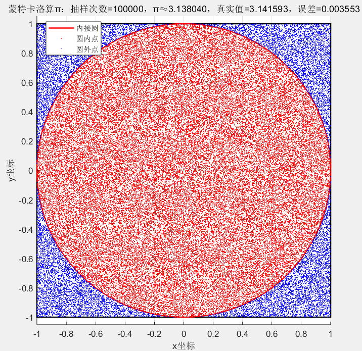 title(sprintf('蒙特卡洛算π:抽样次数=%d,π≈%.6f,真实值=%.6f,误差=%.6f', ...N, pi_approx, pi_true, error));